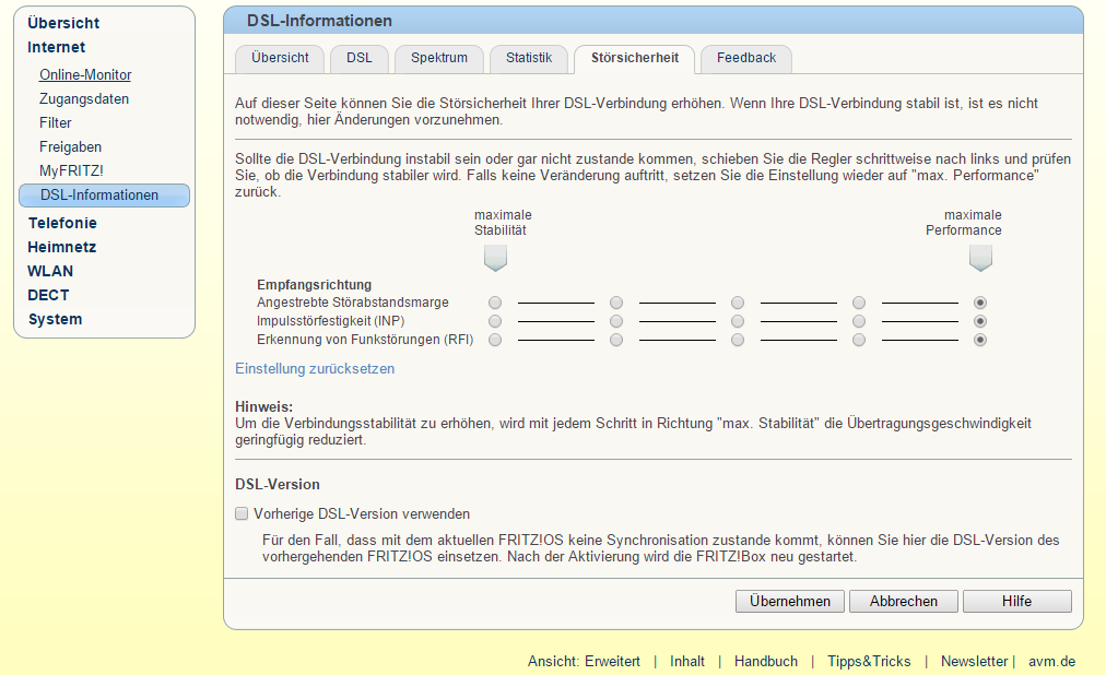 In deinem Keller hängt ein APL, Anschlusspunkt Linientechnik. Wenn links das Kabel der T-Com reingeht und rechts deins raus, dann darfst du auf der rechten Seite des Klemmbretts rumfummeln. Auf der linken nicht! Ich hab allerdings keine Ahnung ob du tatsächlich solche Drosseln einbauen darfst... du hast eine Fritze, hast du gesagt? Tu folgendes: - auf's Webinterface der Fritze gehen und unten rechts die Ansicht auf "Erweitert" stellen (da müsste "Ansicht: Standard" stehen) - auf Menü "Internet" gehen - auf Submenü "DSL-Information" gehen - auf Reiter "Störsicherheit" gehen - alle Schieber ganz nach links Siehe angehängtes Bild. Nur bei dir sollten die Schieber nach links, anders als bei mir. ;) Das sollte erst mal reichen. Ich hatte 2010 dieselben Probleme mit einem Anschluss von Alice und dann O2 (haben ja Alice übernommen). Versprochen waren 16000, es kamen 11000 tagsüber an und 7000-8000 abends. Abends gab es mehrere Resyncs, teilweise konnte ich die Uhr danach stellen. So ist zum Beispiel JEDEN Abend um 21:13 der Sync zusammengebrochen. ;) Ich musste etwas die Technische Hotline nerven, aber sowohl Alice wie auch O2 haben beim DSLAM meine Max-Datenrate runtergestellt auf 6,5 Mbit/s, und damit war die Leitung stabil! Ruf doch einfach an und frag, ob sie die maximale Syncrate des DSLAMs runterstellen können.