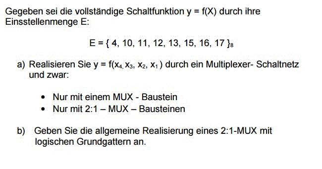 Hallo, Ich hab im Anhang eine Übungsaufgabe hochgeladen. Wie die Aufgabe zu lösen ist weiß ich denk ich mal. a) Ein MUX einfach mit 2 S eingängen b) 2x 2:1 MUX in ein Oder. Meine Frage jedoch. Was hat es mit der Einstellmenge auf sich?