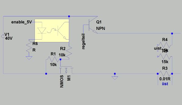 Ich habe mal eine grobe Zeichnung des Netzteils zusammen geklickt. Spannungsquelle 40V, Transistor, rechts der Ausgang, Abgriffe zur Spannungsmessung, links unten der Shunt und unten links schließlich ein N-Mosfet. Im normalen Zustand ist es geschlossen (G=S über Widerstand). Es kann dann zum "Scharfschalten" des Netzteils über den Optokoppler leitend geschaltet werden. Ohne Optokoppler geht es wohl nicht, da die Schaltungsmasse ja an Drain hängt und nicht an Source. Spricht was gegen dieses Konzept?
