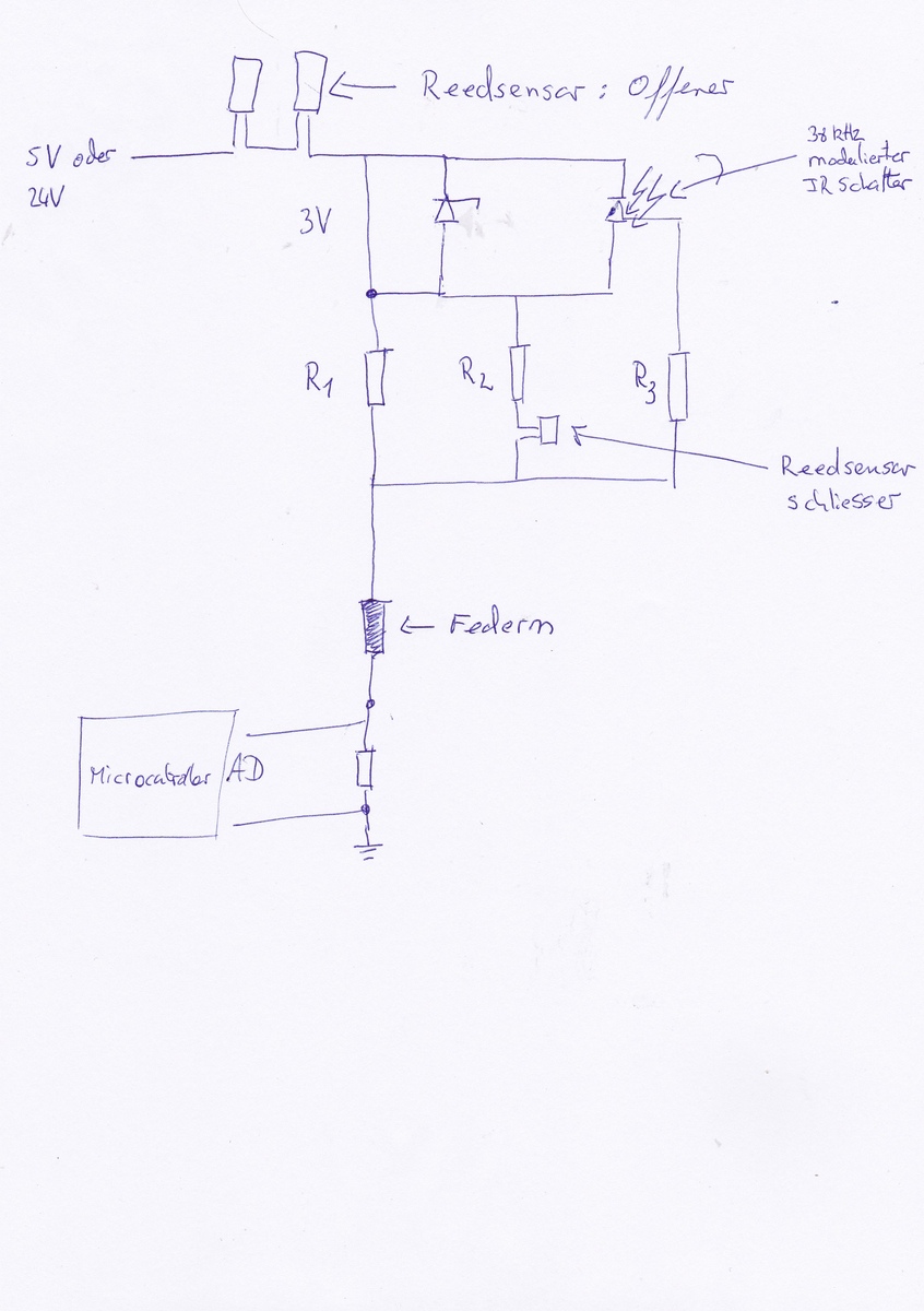 Moin Leute, bin neu hier und freue mich auf die Unterhaltungen. Ich stehe hier als Frischling und brauche grundsätzliche Hilfe. Ich bin kein Experte nur ein Interessierter, deshalb bitte ich um Verständnis. Ich habe eine Schaltung angehängt. Ja sie ist Rudimentär, denn ich will erstmal nur wissen ob sowas grundsätzlich geht. Die Schaltung soll sowohl Signal als auch Spannungsversorgung für und von ein "Sensorarray" liefern. Ich gehen beispielsweise mit 5V in die Schaltung. "Ausgelesen" wird der Sensorarry am AD Wandler des Microcontrollers. Oben sind erstmal zwei Reedschalter, die den Strom unterbrechen wenn sie ausgelöst sind. Spannungsabfall am AD = 0. Die Zahnerdiode versorgt einen IR Sensor, der mit 38 khz moduliert ist mit einer Spannung (3V). und im unteren Abschnitt habe ich drei Widerstände in Reihe, die je nach Zustand ausgelöst werden. In R1 fliesst grundsätzlich ein Strom (Spannungsteiler mit Zehnerdiode). Wenn der mittlere Reedrelais ausgelöst wird, steigt die Spannung am AD Wandler, da der Widerstand R2 kleiner ist. Anschliessend letzte Variante: Wenn die Lichtschranke ausgelöst wird, steigt der Spannungsabfall auch am AD,aber mit einem anderen Wert. In der Schaltung sind zwei Federn, die als Induktivität interpretiert werden könnten. Was kann man für eine Auswrikung erwarten? Vertögerung des Signals? Kann sowas funktioneren? Dsa ist nichts anderes als ein billiger analoger Multiplexer / Demultiplexer. mfg, JC