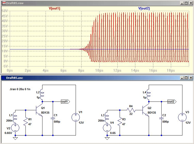 Hallo Zazzle Die PA schwingt, falls die Beschaltung am Kollektor und an der Basis die selbe Frequenz zuläßt. Der Transistor dreht das Signal um 180°. Falls nun bei irgendeiner Frequenz der Schwingkreis am Kollektor das Signal um weiter 180° dreht und der Transistor durch die Miller-Kapazität koppelt, gehts los. Wird die PA nicht angesteuert, liegen an der Basis Null Volt und die Schwingung stoppt. Beim Senden wird regelmäßig der Bereich um 0,6-0,7V durchschritten, was die parasitäre Schwingung erneut startet. Diese Frequenz ist nicht konstant, sondern hängt vom Arbeitspunkt des Transistors ab. Zusätzlich bilden sich sicherlich Mischprodukte aus der ansteuernden Frequenz und der parasitären. Ein Widerstand nach GND funktioniert nicht, es schwingt selbst bei 10 Ohm noch. Abhilfe schafft meist ein Widerstand in der Basisleitung. Die Wirkung ist doppelt: Der Basis-Schwingkreis wird bedämpft und die Kopplung zwischen Kollektor und Basis-Schwingkreis wird gestört. Gruß, Bernd