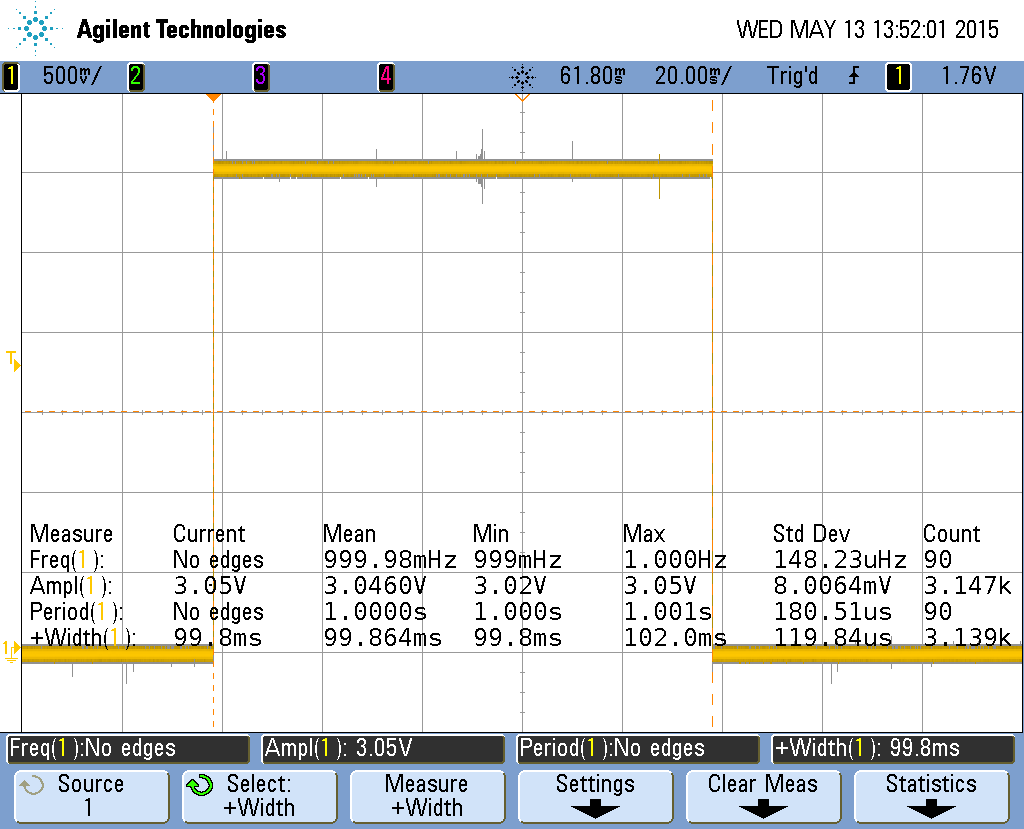 hp-freund schrieb: > wie wäre > ebay 271079582518 ? > High accuracy 1‐PPS timing support for Timing Applications (10ns jitter) Leider ist das MT3339-Modul noch nicht angekommen, deshalb hier nur die Messungen mit dem GR-230XX bzw. GSP2e und externer Antenne. Gemessen wurde mit einem MSO6034 am Timemark-Pin ohne LED. Leider habe ich keine Angaben zur kurzzeitstabilität des Oszis gefunden, der Jitter könnte entsprechend auch vom Oszi kommen. Die Screenshots sind nicht chronologisch angeordnet. Zuerst wurde gewartet bis der GPS-Empfänger das 1PPS-Signal ausgibt, danach die Antenne ausgesteckt und das Signal (mit ∞Persist) aufgezeichnet. Der Trigger liegt auf dem vorhergehenden Impuls und ist entsprechend um 1s verschoben (PPS_ohne_Ant). Danach wurde die Antenne eingesteckt, das Timemark-Signal scheint sich auf die GPS-Zeit zu synchronisieren (PPS_Ant._angeschlossen). Das Signal wurde anschliesend unterschiedlich lange aufgezeichnet, der Jitter scheint im Bereich von ~200 ns zu liegen. In Jitter_50min wurde vergessen die Statistik nach dem Ändern der Zeitbasis zurückzusetzten, die Werte sind entsprechend mit Vorsicht zu genießen. Angaben zum Timing konnte ich nur beim SirfStarIII-Chipsatz finden: TIMEMARK (multiple use pin: Also noted as GPIO[9]) This pin provides the 1pps output desired for certain applications. This is a CMOS level output. This function is available with an approximate accuracy of +/- 35ns, but could be as high as +-100ns over all conditions and temperatures. The rising edge is synched to the GPS Epoch. Gibt es genauere Angaben für den SirfStarII-Chipsatz damit ich meine Messung überprüfen kann?