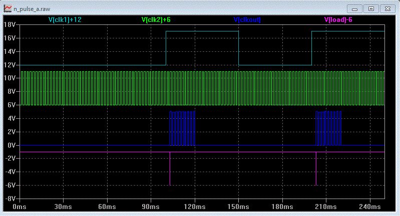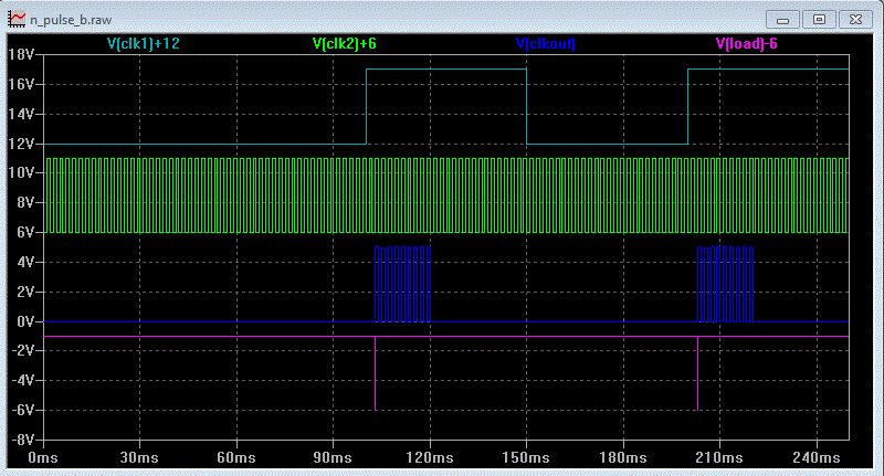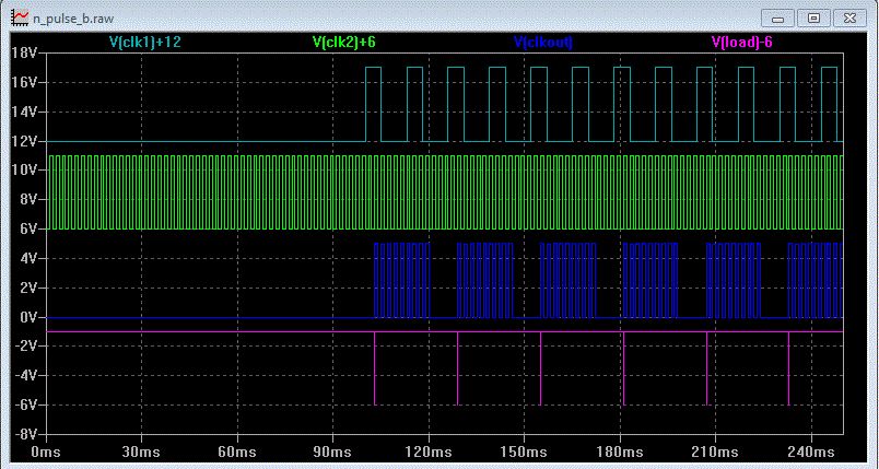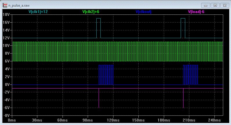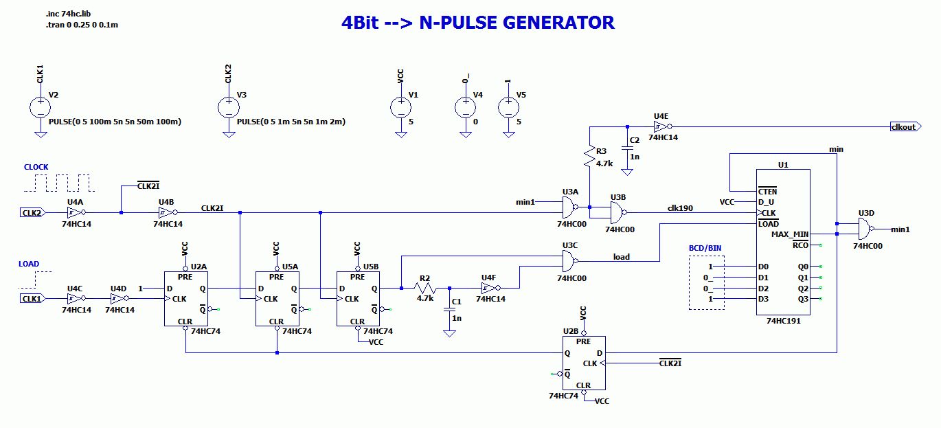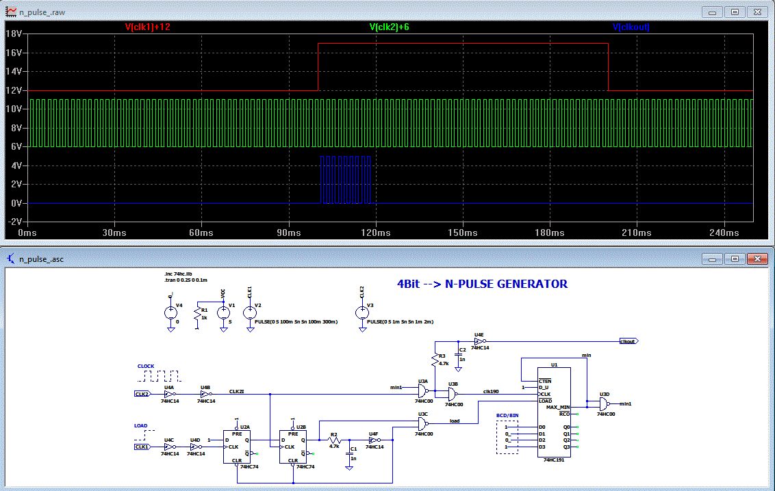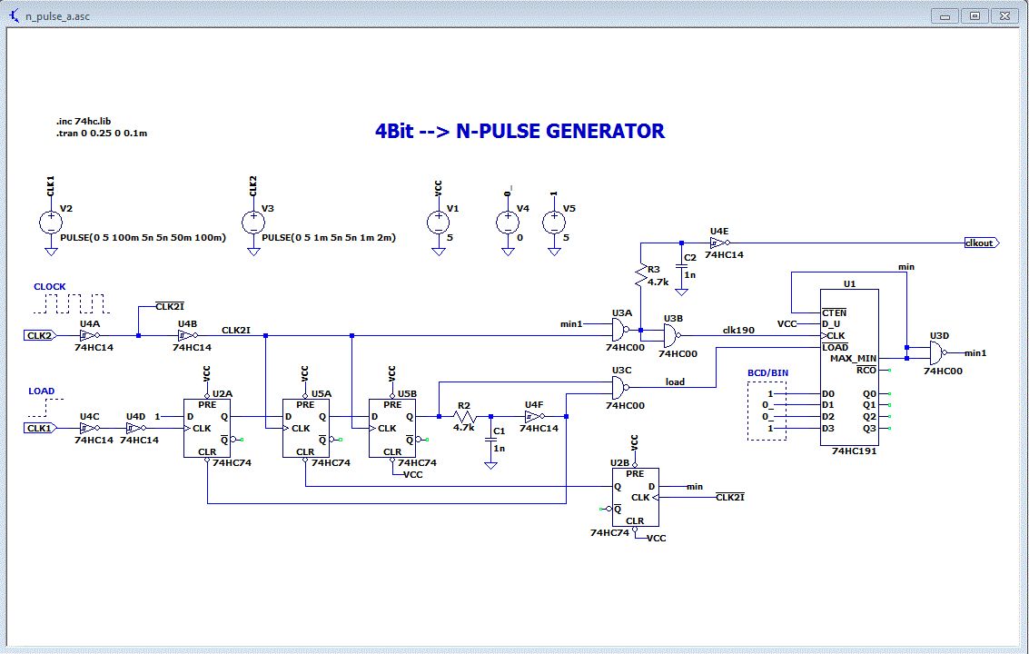 Hallo, Hier mal eine Schaltung mit 4 ICs und die Simulation mit LTspice. Die .asc-Dateien im zp-file sind die Schaltpläne. Einfach den zip-file z. B. nach C:\test entpacken und dann den npulse_.asc mit LTspice öffnen. Helmut