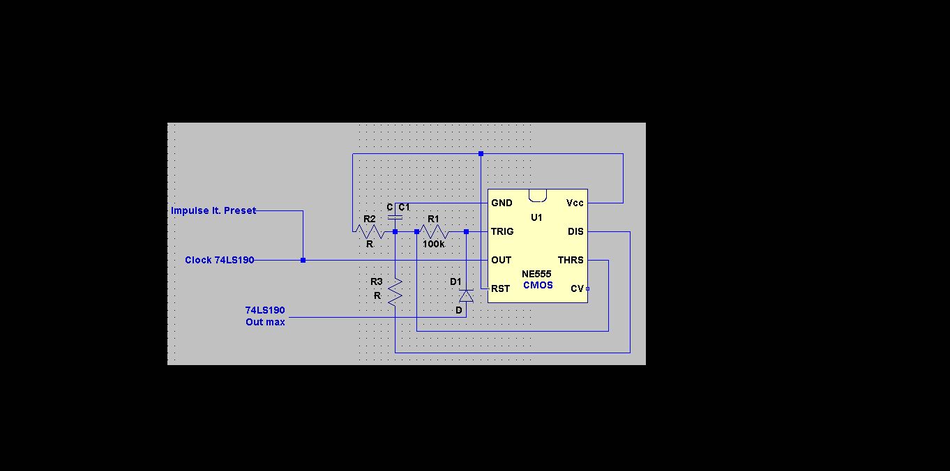 So geht es ohne zusätzliche Gatter. Der 555C liegt an Vcc 5V und liefert als astabiler MV die Impulse. Der Trigger-Eingang des 555C wird durch den max-Ausgang hochgezogen, so dass er nicht weiter triggern kann, solange out_max hi ist.