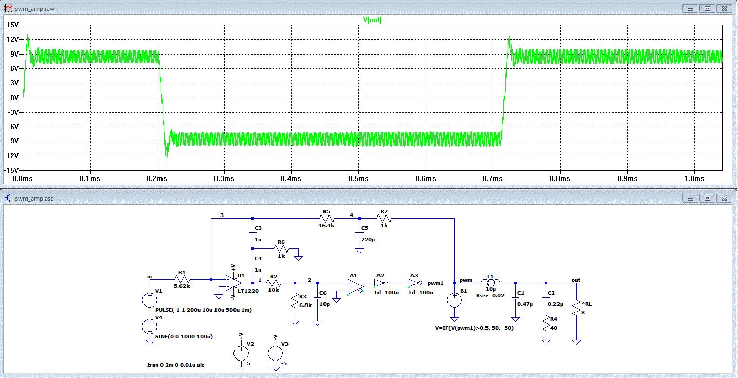 Hallo, Ich habe dir mal ein Simulationsmodell für LTspice gemacht. Damit kannst du ganz schnell verschiedene Dinge ausprobieren. Die Datei pwm_amp.asc in ein Verzeichnis C:\Test kopieren und dann mit LTspice öffnen. Gruß Helmut