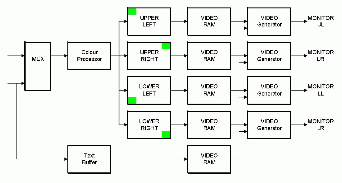 E. M. schrieb: > Es wären dann 5 von den boards nötig! Nach meinem Dafürhalten müsste es mit dem oben gezeigten System gehen. Man braucht 2 FPGA-boards mit jeweils einem eigenen leicht modifizierten image, das jeweils zwei Monitorausgänge treiben kann. Also ein 2x2-System. Die Eingänge speist man einfach parallel mit einem physikalischen splitter auf Signalebene. Der muss ja nichts können, außer duplizieren. Ich stimme aber zu, dass es prickelnder wäre, alles auf einem board zu haben, nur dann hat man das Problem der Ausgänge: Jeder Ein- und Ausgang braucht für 8 Bit RGB mit Takt z.B. 28 eigene Leitungen zum Treiberchip. Wenn der Chip noch Steuerleitungen hat und 10 Bit benutzt werden, sind es rasch 35. Man könnte einen FPGA für die Eingänge und einen für den Ausgänge nehmen. Der erste selektiert die Eingänge und macht das Vorprozessieren sowie das Verteilen auf einen parallelen Bus mit 2 Kanälen. An den kann man ein FPGA mit je 4 Ausgängen dranhängen. Davon werden entweder alle benutzt oder nur 2 oder 3 und dann ein weiteres board kaskadiert. Mit 3 boards wären es schon 10 Ausgänge, mit 5 boards 16!