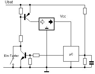 Holger Krähenbühl schrieb: > Funktioniert wegen den Schutzdioden meines uC > aber nicht so ganz richtig Es ist aber doch klar, dass jede Spg auf einem Port-Pin die Vcc über die Schutzdioden hochzieht. Ab irgendwo über 1V ist der µC darüber voll eingeschaltet. Bei meinem Vorschlag passiert das nicht, da der µC nicht aktiv ausschaltet, sondern nur einschaltet. Die Idee kommt übrigens von dem AVR-Transistortester.