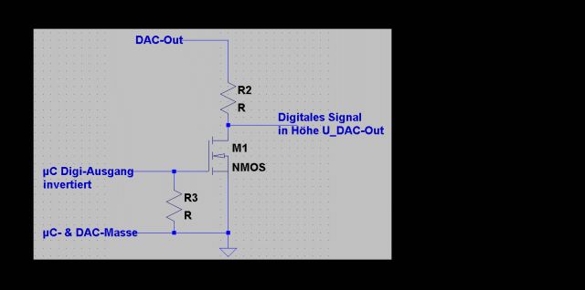 Warum nicht einfach einen Serienwiderstand am DAC-Ausgang und dahinter einen simplen N-FET, der das Signal dann auf Masse zieht?