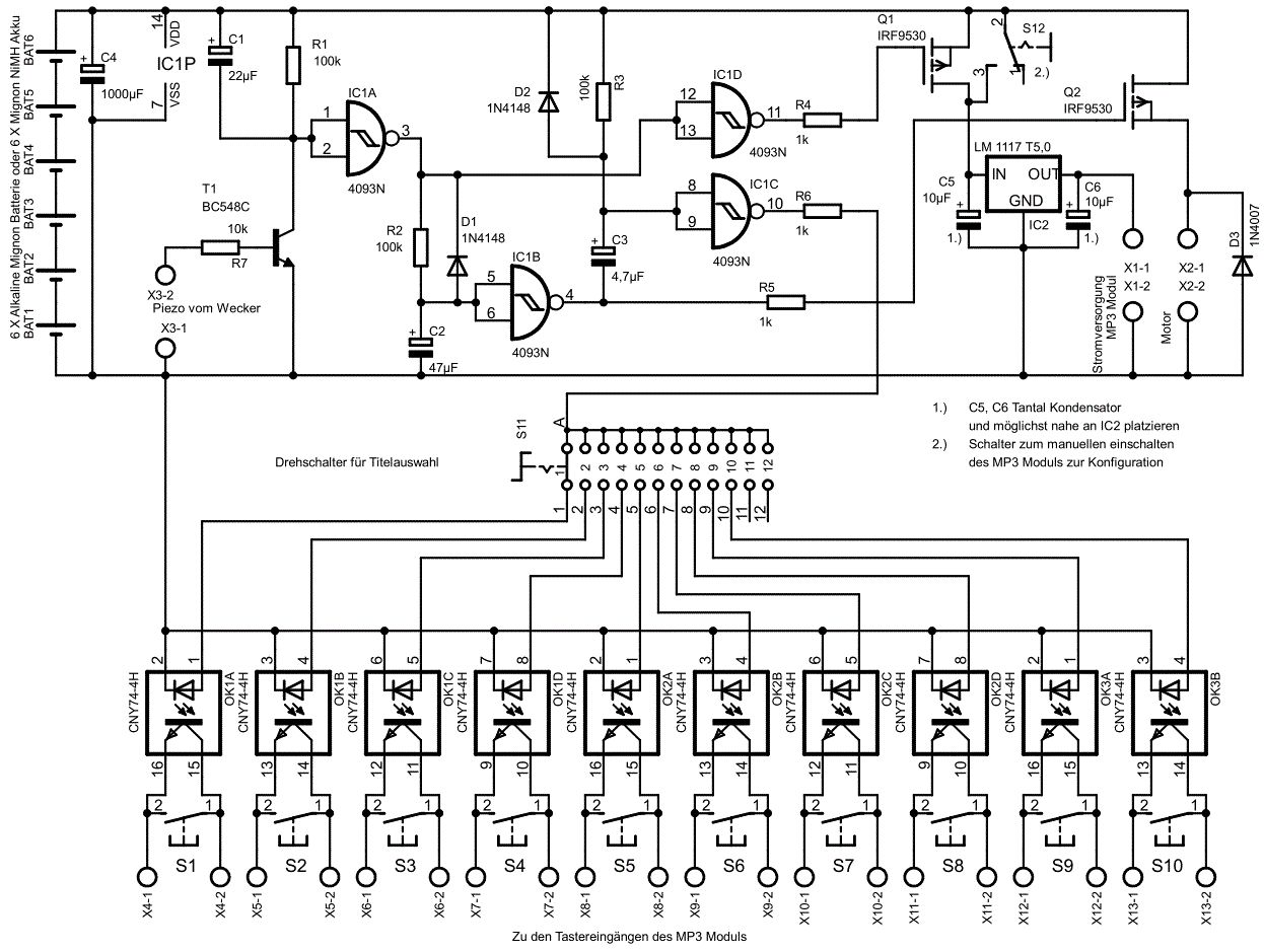 Also die Uhr würde ich weiter mit den Batterien im Batteriefach der Uhr betreiben und nur die beiden Leitungen des Piezos herausführen. Also mit Mignon Batterien macht der Batteriebetrieb der Schaltung schon sinn. Ja, rein rechnerisch wären 3 Mignon (4,5V) zur Versorgung des MP3 Moduls ideal. Aber wenn du dir die Entladekurve einer Mignon mal anschaust erkennst du dass die Spannung der Batterie über ihre Lebensdauer kontinuierlich abfällt. Schon nach kürzester Zeit fällt die Spannung einer Zelle unter die 1,5V und der MP3-Player würde nicht mehr funktionieren obwohl die Batterien noch "randvoll" sind. Richtig gut designte batteriebetriebene Geräte saugen die Batterien bis auf 0,9V leer. http://batterietest-online.com/bilder/test-201001/gesamtkurve.jpg Ich habe mir die Anleitung von dem MP3-Player Modul mal angeschaut und folgenden Absatz als interessant für dein Problem gefunden: Autoplay (Firmware 1.1) mit der „Autoplay“-Funktion lässt sich beim Einschalten des mSm2 automatisch eine Play-Liste wiedergeben. Dabei handelt es sich um die „AUTOPLAY.TXT“, welche wie eine normale Play-Liste aufgebaut ist und ebenso die Sonderfunktionen unterstützt. Im Download-Beispielpaket ist eine Autoplay-Liste als Beispiel enthalten. Aufruf der Autoplay-Funktion: · Taste 1 und 4 gleichzeitig lange (>10 Sekunden) betätigen „Autoplay“ aktivieren/deaktivieren · Bei aktiviertem „Autoplay“ wird nach Spannungszufuhr automatisch die „AUTOPLAY.TXT“ abgespielt. Es sieht so aus als könnte man sich den Teil meiner Schaltung die den kurzen Impuls erzeugt sparen und einfach das MP3 Modul mit dem Motor zusammen einschalten. Deshalb würde ich einen Spannungsregler vorschlagen der vor das MP3 Modul geschaltet wird und diese Einheit dann einfach zusammen mit dem 9V Motor Ein- und Ausschalten. Warscheinlich wird das MP3-Modul dann aber später loslaufen als der Motor da sich das Modul bestimmt erst initialisieren muss nach dem es eingeschaltet wurde. Darüber habe leider keine Angabe gefunden. Als Spannungsregler würde ich den LM 1117 T5,0 probieren. Man könnte aber auch den Motor durch kleine Veränderung der Schaltung verzögert einschalten, dann würden beide Geräte etwa zur gleichen Zeit loslaufen.