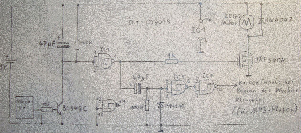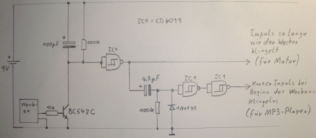 Ich habe meine Schaltung mal live ausprobiert. Mit Erfolg: https://www.youtube.com/watch?v=GKabQ0PQfJY gelbe LED: zeigt Piepen der Uhr an grüne LED: zeigt den Motorsteuerausgang rote LED: demonstriert den Impuls für den (nicht vorhandenen) MP3 Player Anbei habe ich die Schaltung etwas erweitert um eine Treiberstufe für den Motor. Außerdem die Eingänge des vierten nicht benutzten NAND-Gatters auf Masse gelegt (damit der nicht schwingt und Störungen verursacht). Betriebsspannung und die PIN-Nummern des CD4093 sind nun auch eingezeichnet. Den Ruhestrom habe ich auch gemessen und der beträgt 0,1µA !! Das mit dem Stromverbrauch ist natürlich heftig für einen 9V Block. Probleme könnte auch der höhere Innenwiderstand des 9V Blocks machen. Besser wäre ein Batteriehalter mit 6 Mignons die deutlich kleinere Innenwiderstände haben (wenn man die richtigen kauft) Eine Nuß wäre da aber noch zu knacken. Und zwar daß der MP3 Player ja 5V braucht. Da braucht es ja erstmal einen Spannungsregler der ja leider auch wieder Ruhestrom verballert...