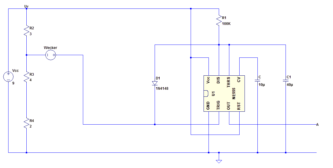 Hey Mick, danke malwieder! OK, ich denke vom Prinzip her habe ich es verstanden. Ich hab jetzt nur ein Problem, das sich in der Simulation mit LTspice gezeigt hat. Und zwar triggert der NE555 sobald Spannung anliegt und bleibt auch in dem Zustand. Also die Ausgangsspannung ist gleich Vcc. Dieser Zustand scheint sich nur beheben zu lassen, indem die Triggerspannung auf über ca. 2/3 Vcc gehoben wird. Ich habe zwar gelesen, dass der NE555 beim Einschalten den ersten Zyklus startet, aber in meiner Simulation ist das kein Zyklus sondern ein Dauerzustand, das verstehe ich nicht so recht... Grundsätzlich lässt sich das Problem beheben, indem ich am Trigger einfach eine entsprechend große Grundspannung anlege, allerdings überschreitet die Triggerspannung dann fast den Maximalwert Vcc, sobald das Weckersignal hinzukommt. Also beispielsweise: Vcc = 9V Vtrigger = 6V Wecker mit OPV = +-3V So kommt am Trigger bei Klingeln des Weckers 6V+-3V an. In der Simulation reicht das allerdings nicht den Zyklus auszulösen, es müssen unter 3V sein. Sobald ich die Grundspannung von 6V verringere kriege ich den Ausgangszustand nicht weg und sobald ich das Weckersignal weiter anhebe komme ich über Vcc. Ich wollte das Signal jetzt gleichrichten, verstärken, invertieren und anschließend den 6V überlagern. Sodass z.B. 6-5V rauskommen am Ende. Hier komme ich allerdings mit der Schaltung nicht klar. Ich habe mal ein Bild meiner aktuellen Schaltung in den Anhang geladen. Wie kann ich hier das Weckersignal alleine modifizieren (gleichrichten, verstärken und invertieren) und anschließend der 6V Spannung überlagern? Wenn ich die entsprechende Schaltung hinter das Weckersignal schalte, dann wird das bereits überlagerte Signal von 6V+-0,7V modifiziert... Und wenn ich eine abgetrennte Schaltung mache, dann hätte ich auf dem Minuspol die Erde und kann das schlecht in Reihe schalten.. Naja ok, jetzt habe ich alle restlos verwirrt. Weiß trotzdem jemand eine Lösung für das Problem? Riesen Dankeschön! Grüße, Phil.
