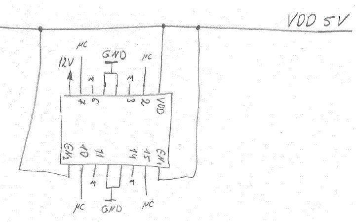 Lothar Miller schrieb: > Welche 5V muss der wie "vertragen"? Genau hier habe ich ein Verständnisvollem. Wenn ich den l293 wie in der beigefügten Kritzelei anschließe (ohne Motor und ohne Mikrocontroller), hat er an den Eingängen 2, 7, 10, 15 (das sind die Pins die später mit dem Mikrocontroller verbunden werden) immer 5 Volt, an allen gleichzeitig. Somit bekommt der STM32 immer 5 Volt ab, oder? Und an den Pins 3, 6, 11, und 14 immer 12 Volt. Frank T. schrieb: > Am STM32 jeweils 100nf. > In den Steuerleitungen je einen Widerstand 1Kohm einfügen.Wenn der wert > zu > groß ist dann mit 470 ohm bis abwärts 100 ohm probieren. Danke, werde ich morgen testen. Danke allen für die Unterstützung Rainer