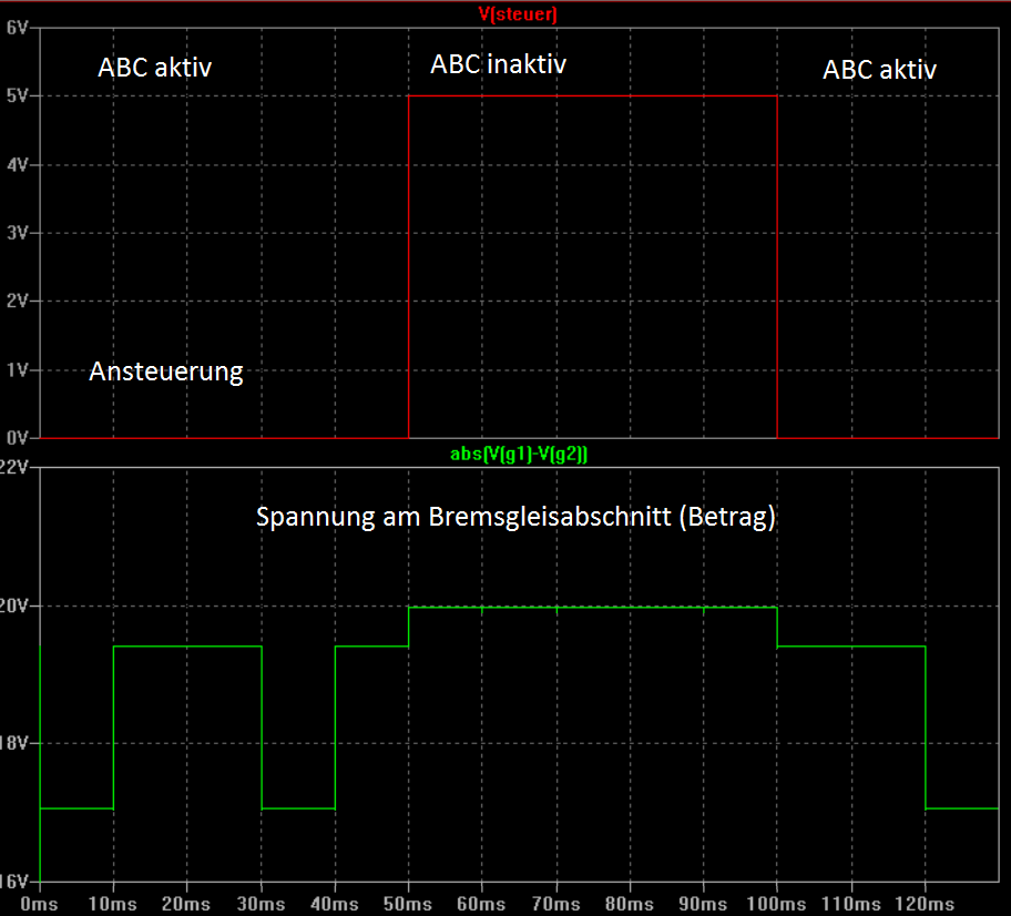 Hallo Wolfgang, vielen Dank nochml für die Fleißaufgabe. Allerdings stimmt etwas noch nicht. Das Signal an der Schiene ist ja ein moduliertes Rechtecksignal -/+ 18V (je nach Zentrale von 15 - 22V). http://tonystrains.com/lenz-asymmetrical-dcc-and-abc/ Ist ABC aktiv wird die Spannung um 2,1V niedrieger im positiven Anteil. Das Rechtecksignal muss weiterhin am Gleis bestehen bleiben. Ich denke dass der Kondensator dies glättet. Es ist aber so dass bei DCC im Gegensatz zu Selectrix/Märklin die Lok im Bremsabschnitt steuerbar (Rückwärts wegfahren, Soundgeräusche und Licht an/aus usw.) bleibt. Nur der Fahrbefehl vorwärts wird vom Decoder nicht mehr ausgeführt. Es darf also nicht von einem modulierten Signal in eine Gleichspannung gehen. Außerdem gibt es noch eine Besonderheit. Bei DCC gibt es alle paar ms eine Austastlücke (Zentrale/Booster schaltet den Strom ab und die Loks senden Informationen an die Zentrale zurück). Dies darf nicht gestört werden. http://www.opendcc.de/info/railcom/railcom.html Gruß Stefan