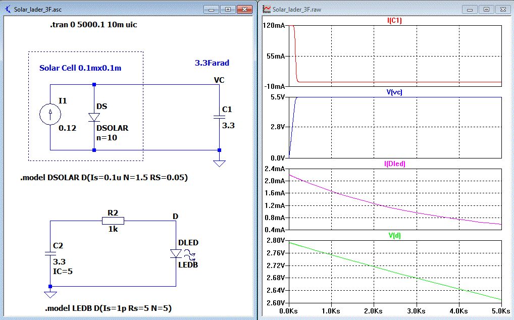 Ich habe noch ein Solarpanel gefunden das liefert 4,5V bei voller Sonnenstrahlung und bei bedeckten Himmel auch, das andere nur 0,5V Habe die Beiden in Reihe geschaltet und komme auf ~5V. Meine Simmulation zeigt das eine Led mit 1kVorwiderstand dann 35 Minuten leuchten wurde bei einem Verbrauch von 20mA und den 3,3F Cap. Also von 2ma bis 1mA. Der Ladevorgang dauert 2,65 Sekunden. Bei einem Ladestrom von 120mA. Irgendwas habe ich falsch angenommen, der Supercap ist noch lange nicht bei 5V... Nehmen wir einen Ladestrom von 5mA dann sollte der C nach 50 minuten geladen sein. Und wieso die Z-Diode Parallel? ich muss doch nur den Rückfluss in das Solarpanel verhindern also z-diode in Serie oder nicht?