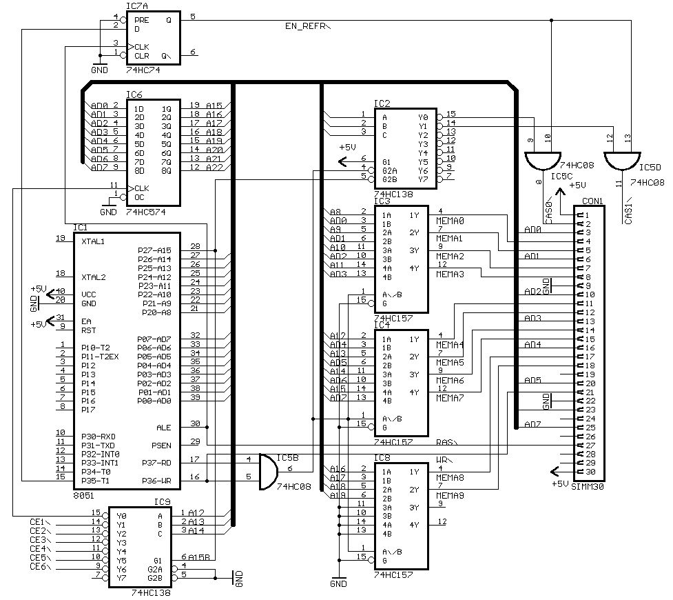 @Benedikt: danke fuer den Plan. Aber das die Schaltung kann kein RAS und CAS in einem Zyklus, muss also der Prozessor wieder ran ... 3,3 Volt CPLDs sollten es auch tun ... Fuer die Spartan 3 FPGAs von Xilinx hab ich schon nachgeguckt: mit richtigen Vorwiderstaenden (zur Strombegrenzung) akzeptieren die auch 5 Volt Eingang. Der SIMM hat ein VIH von 2.4 Volt, was auch passt. Ein Schreiben oder Lesen in einer Row refreshed die ganze Row. Und sonst muss zwischendurch ein Timer im CPLD ein CBR refresh machen. Die CPLD koennte an den Takt des uC angschlossen werden. Wie hast Du das mit dem Refresh beim 8051 gemacht? Muss doch der Prozessor machen? Gruss Thorsten
