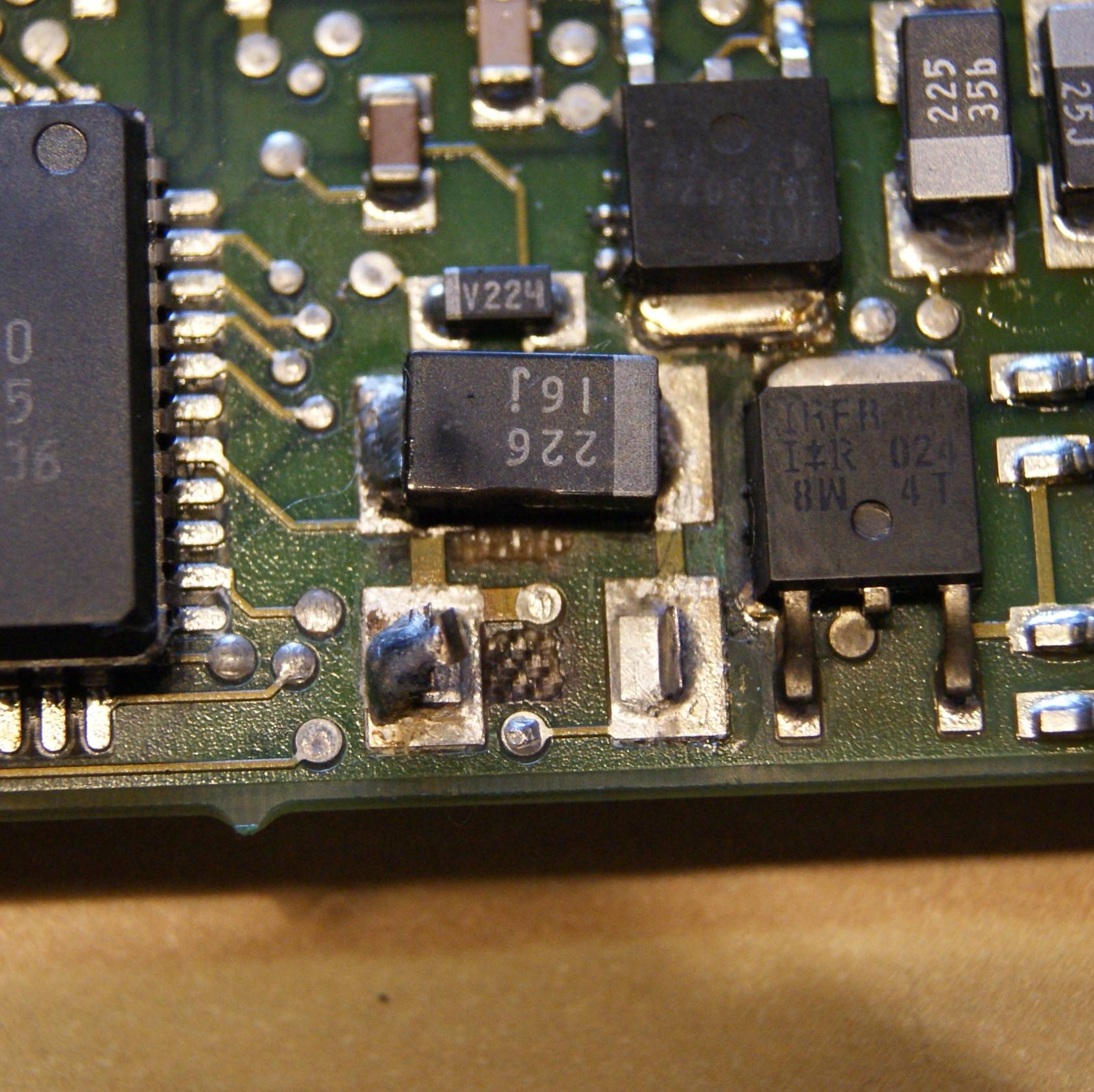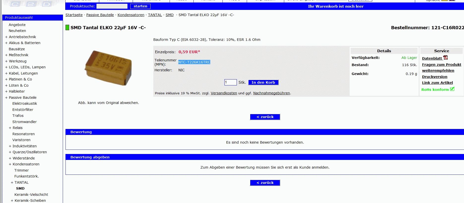 Ich hab jetzt einmal versucht eine günstige Variante zu finden... Kann ich auch den Elko vom Bild oder diesen verwenden: http://www.conrad.de/ce/de/product/458294/Tantal-Kondensator-SMD-22-F-16-V-10-Kemet-T491B226K016AT-1-St?ref=searchDetail Wie müssen denn die elektrischen Parameter passen? Reicht es wenn der neue die Parameter 22 uF und 16V sowie die passende Größe erfüllt?