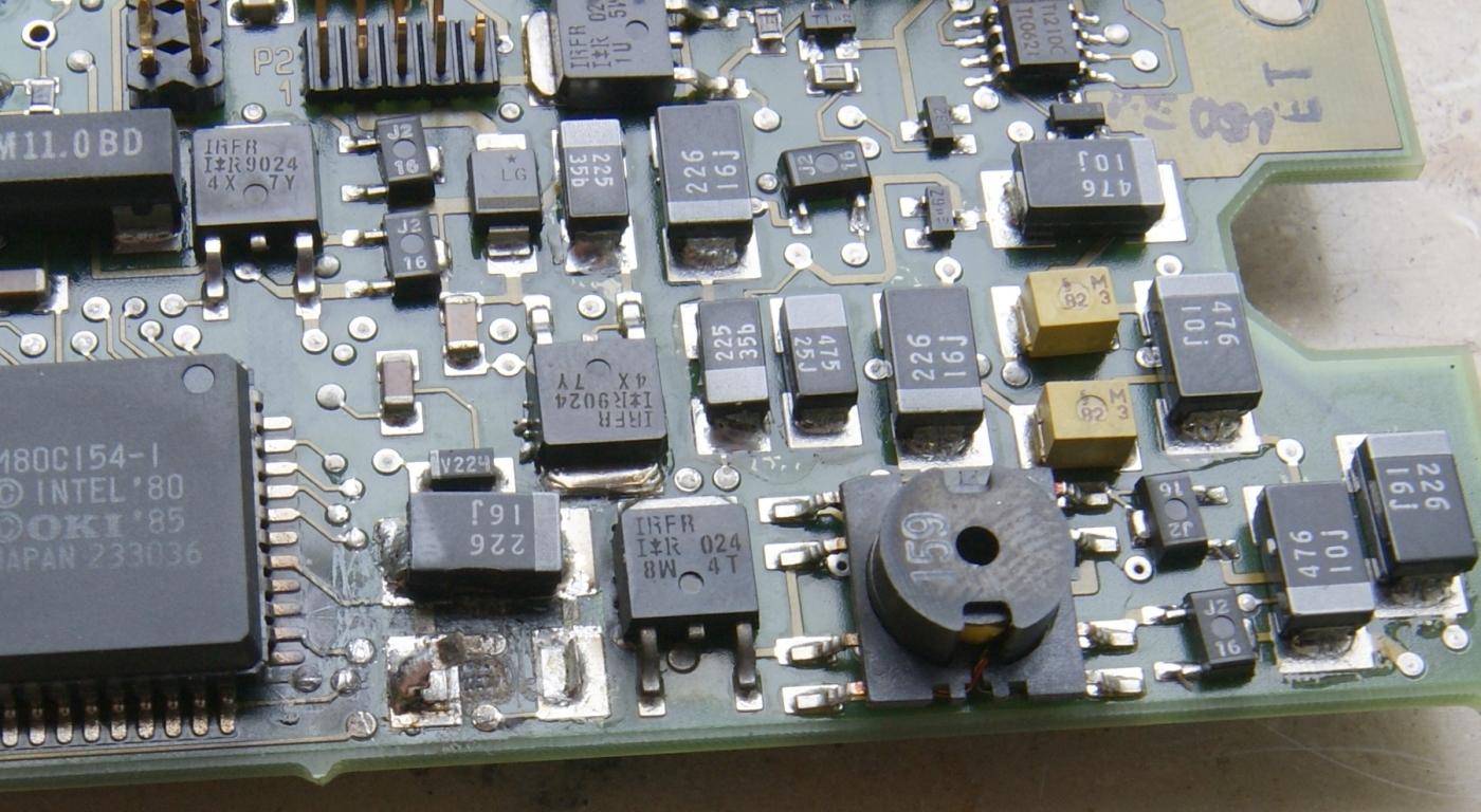 Wie oben schon (von Bernard B.) vermutet wurde, funktioniert das ganze nach dem Tausch der 2 Kondensatoren doch nicht. Nach dem Einlegen des Akkus wird leuchtet zwar die Displaybeleuchtung des Gerätes aber der Systemstart beginnt nicht. Jetzt wird das Teil links neben den gelben neuen Kondensatoren (s. Bild 8) mit der Bezeichnung M80C154-1 Intel´80 OKI´85 nach dem Akku einlegen sehr schnell sehr heiß und leicht gequalmt hat es auch schon kurz (hab den Akku schnell wieder raus genommen). Könnte der oben genannte Wechsel des "HEXFET power MOSFET (IRFR 024N)" etwas bringen oder wird das dann zur unendlichen Geschichte? Wie könnte eine Fehlersuche aussehen? Ist der Chip M80C154-1 durch die Rauchentwicklung vermutlich auch defekt oder könnte er noch funktionieren?