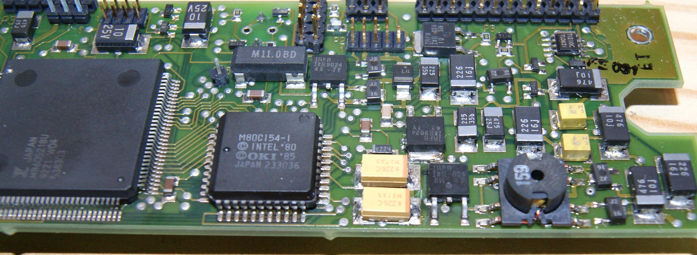 OKI 80c154, Romless Version, und wenn man ein paar der Leiterbahnen mit dem DB abgleicht, dann liefert der Dicke nebenan das Programm. Also nicht alles verloren, da ich vermuten würde, der μC ist etwas billiger als das deffekte Gerät. Unter 3€ bei Bauteile24.de. Scheint ein Ausschlacht-Chip mit ROM zu sein, aber die Beschaltung der ROMless-Variant muß so sein, daß event. ROM ausgeschaltet wäre. Vermutlich hat das Ding eh immer ROM, nur muß es als ROMless weder funktionieren noch was sinnvolles/bekanntes enthalten.