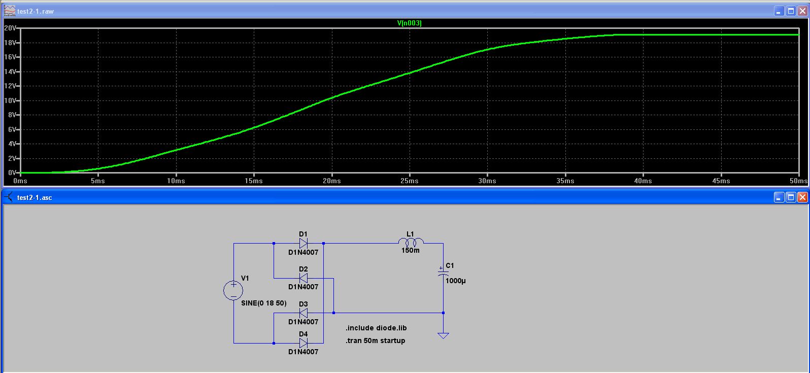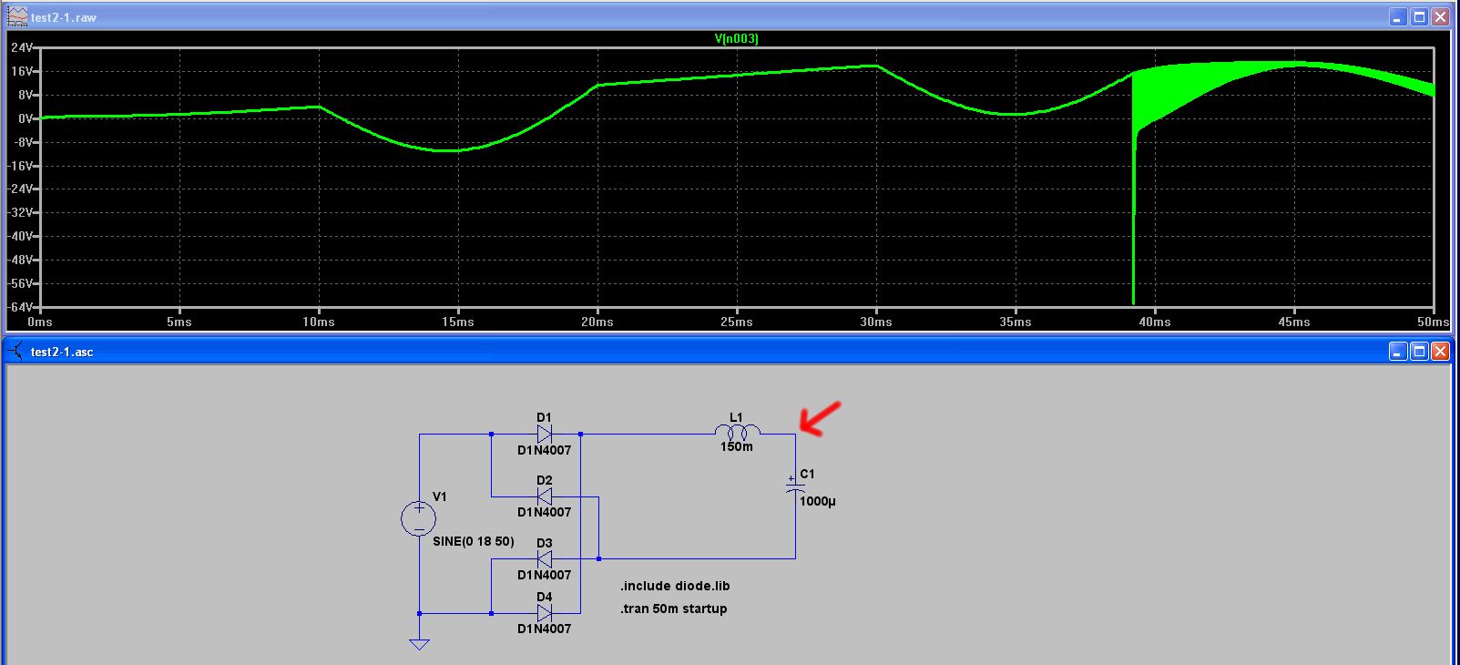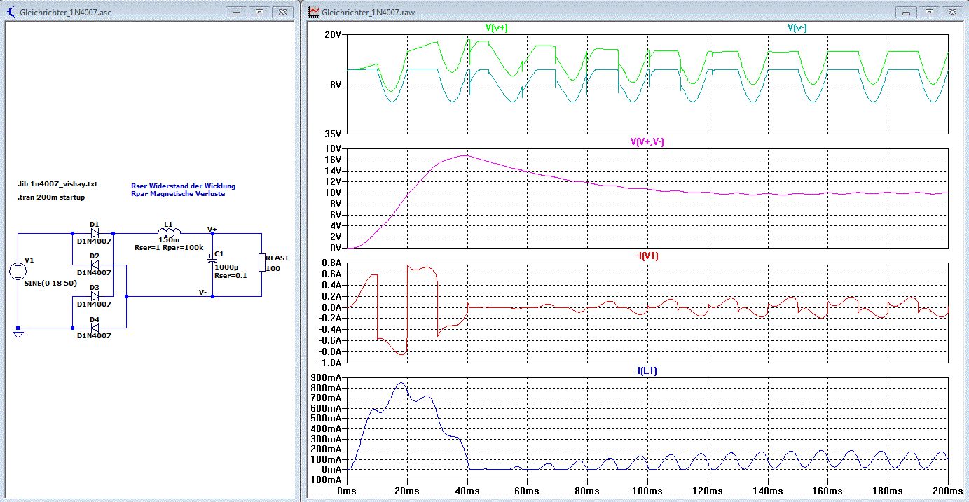 Der Vorschlag von Joe mit dem Parallelwiderstand(Ummagnetisierunsgverluste) lässt die Oszillation praktisch verschwinden. Damit jeder simulieren kann habe ich die Schaltung für LTspice angehängt. Die gleichgerichtete Spannung V(V+,V-) hat einen großen Überschwingunger durch die 150mH Spule. Seit 50 Jahren baut niemand mehr eine solche Spule in den Gleichrichterkreis. Ich wundere mich warum der TO die dann einbaut.
