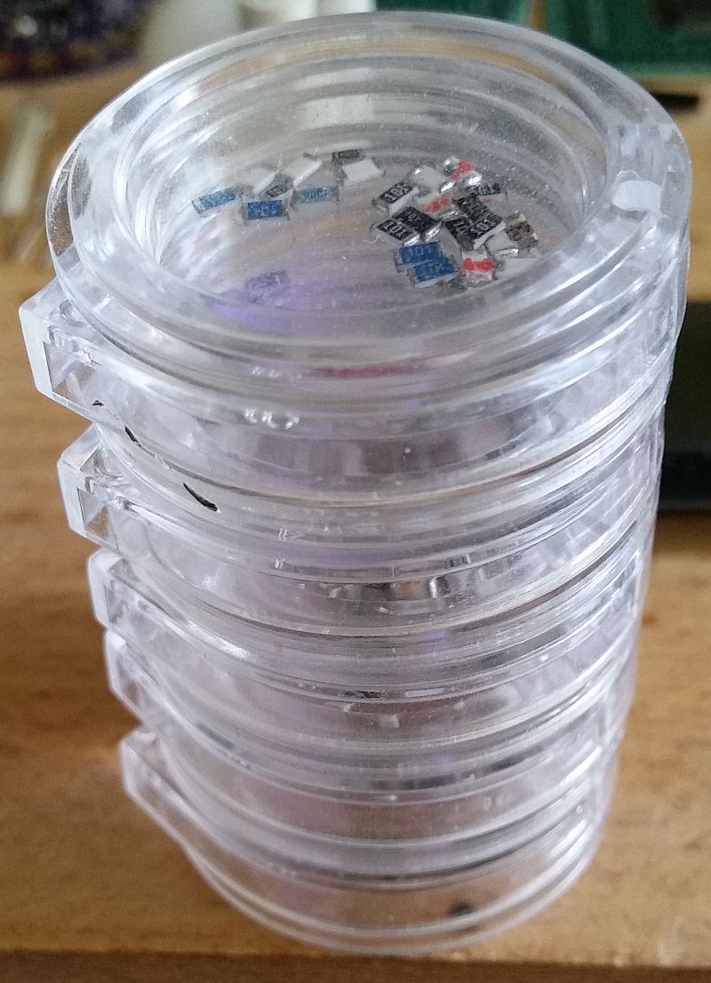 Ich habe hier Medikamentenboxen für 7 Tage als Aufbewahrungsgefäß für SMD so in dieser Art: http://www.sonderpreis-baumarkt24.de/haushalt-und-wohnen/haushaltsartikel/12758/pillenbox-fuer-7-tage-weiss/blau-pillendose-tablettenbox-medikamentenbox Die Bauelemente kann man nach Auf-ziehen eines glasklaren Schiebers mit der Pinzette herausnehmen. Wenn das Ding mal herunterfällt, ist es auch nicht schlimm, weil sich der Inhalt der Fächer nicht "mischen" kann. MfG Paul