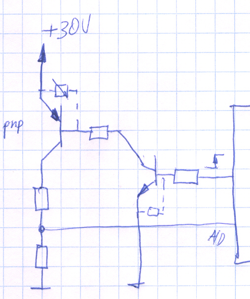 Was sind für Dich Verluste? 1-2mA kratzen doch in der Regel keinen oder? Ansonsten kannst Du ja einen OP verwenden um aus deiner Spannung von 0-14 bzw. 0-30V schöne 0-5V zu machen. Allerdings braucht Du dann eine neg. Spannung für die OPs, damit Du wirklich auch auf 0V kommst.