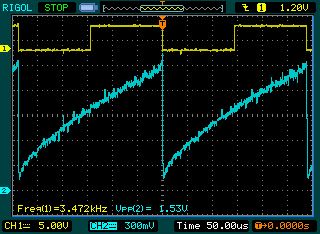Na und ich dachte es wäre ganz einfach einen DDS-Funktionsgenerator zu bauen. Pustekuchen... Ich habe gerade den DAC0800 und den DAC0832 ausprobiert, den DAC0832 auch unter Benutzung von WR1, alle anderen Steuerleitungen nach Datenblatt fix. Ich versuche, deb DAC0832 mit V- == GND und V+ == +5V und Vref = 3.3V oder 5V zu betreiben. Also keine asymmetrische Spannungsversorgung. Noch ohne OpAmp, die beiden Ausgänge nur über ein 25kOhm-Poti an GND gelegt. Bei allen Versuchen, sehe ich ziemlich viel Schmutz und von linear ist das auch weit entfernt. Siehe Bild: Kanal eins ist das MSB, Kanal 2 einer der beiden Ausgänge. Ich habe schon V+ und Vref mit kleinen Kondensatoren (10nF bzw. 100nF) gegen GND gekoppelt, aber das bringt nichts. Ein Versuch einen null-kompensierbaren OpAmp (LF351) und danach einen Tiefpassfilter zu benutzen, schlug auch fehl. Habt Ihr einen Hinweis, wo sich Fehlersuche lohnt? Habt Ihr eine Empfehlung, welchen DAC (und OpAMp) man bei einer einfachen Stromversorgung möglichst direkt vom Arduino-Board verwenden sollte? Gruß Georg