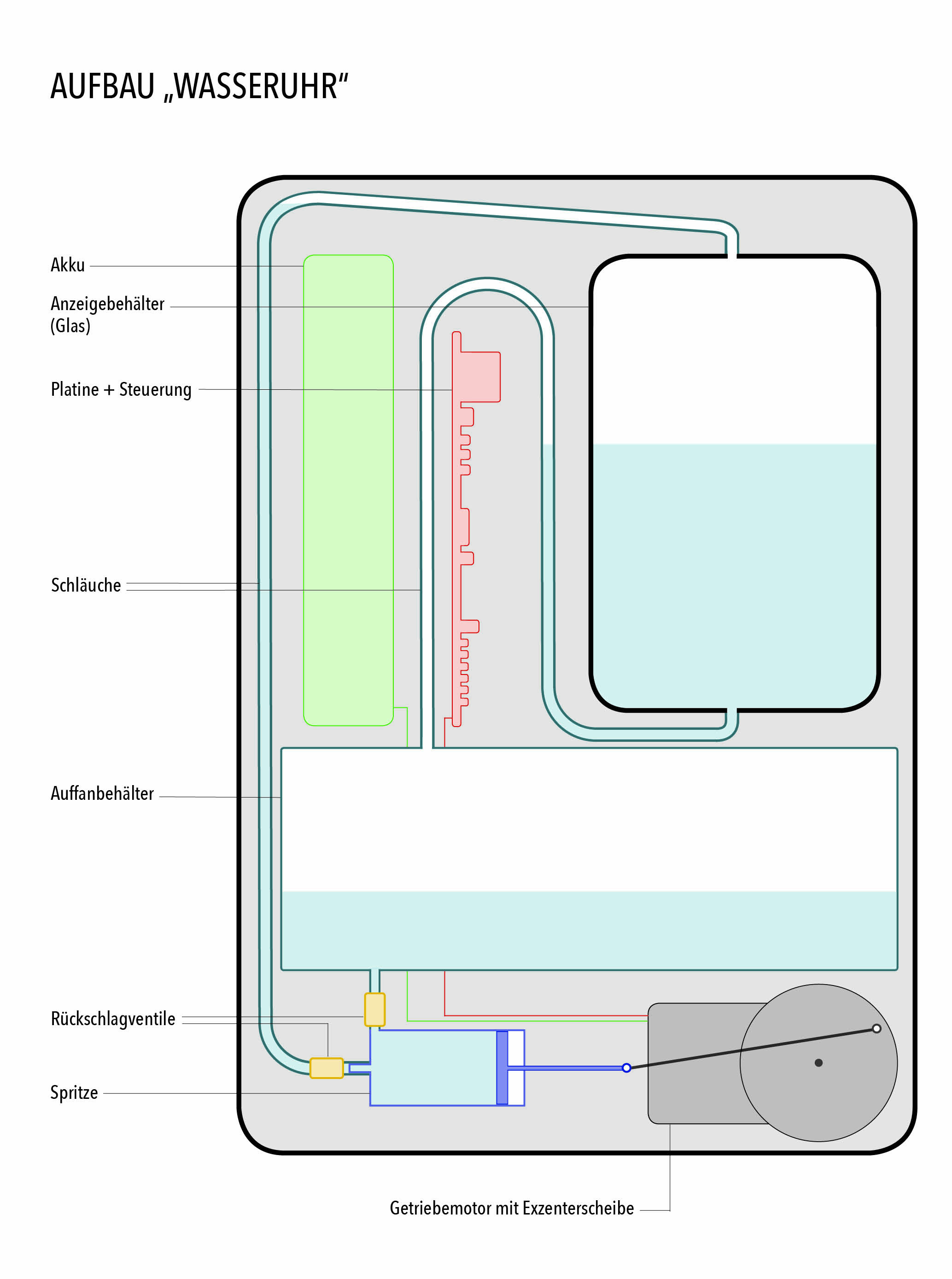 nur ein Hinweis , die Uhr wird mit dem Saugheber und als "geschlossenes" System , nicht funktionieren . Die Luft, im sich füllender Anzeige-Behälter, drückt das Wasser durch den Saugheber und im Auffangbehälter entsteht durch die Pumpe ein Unterdruck.... LG Frank