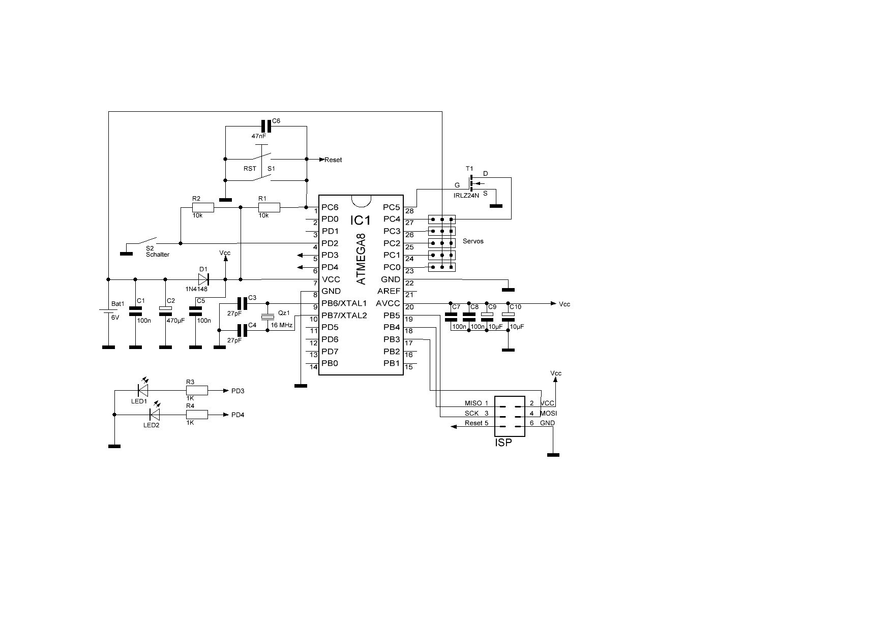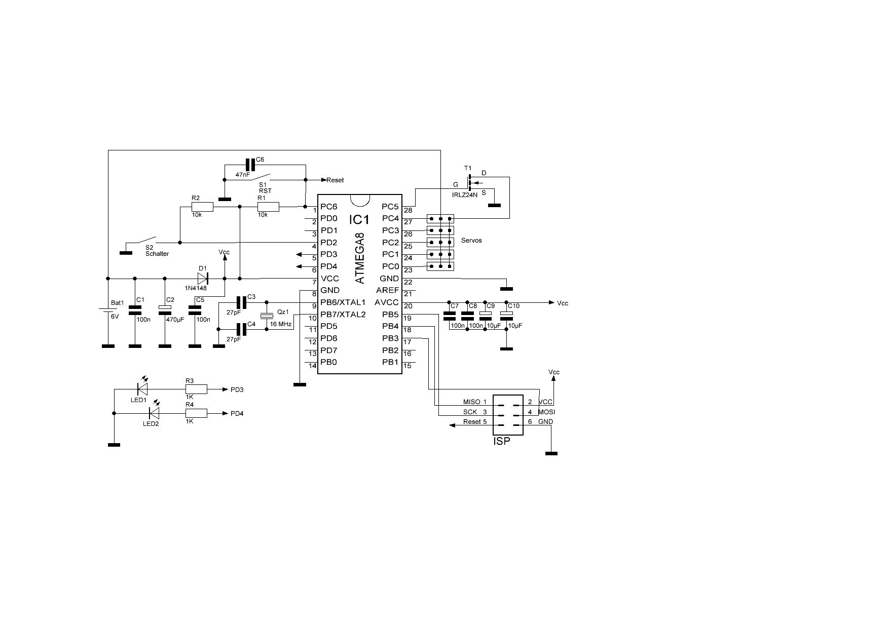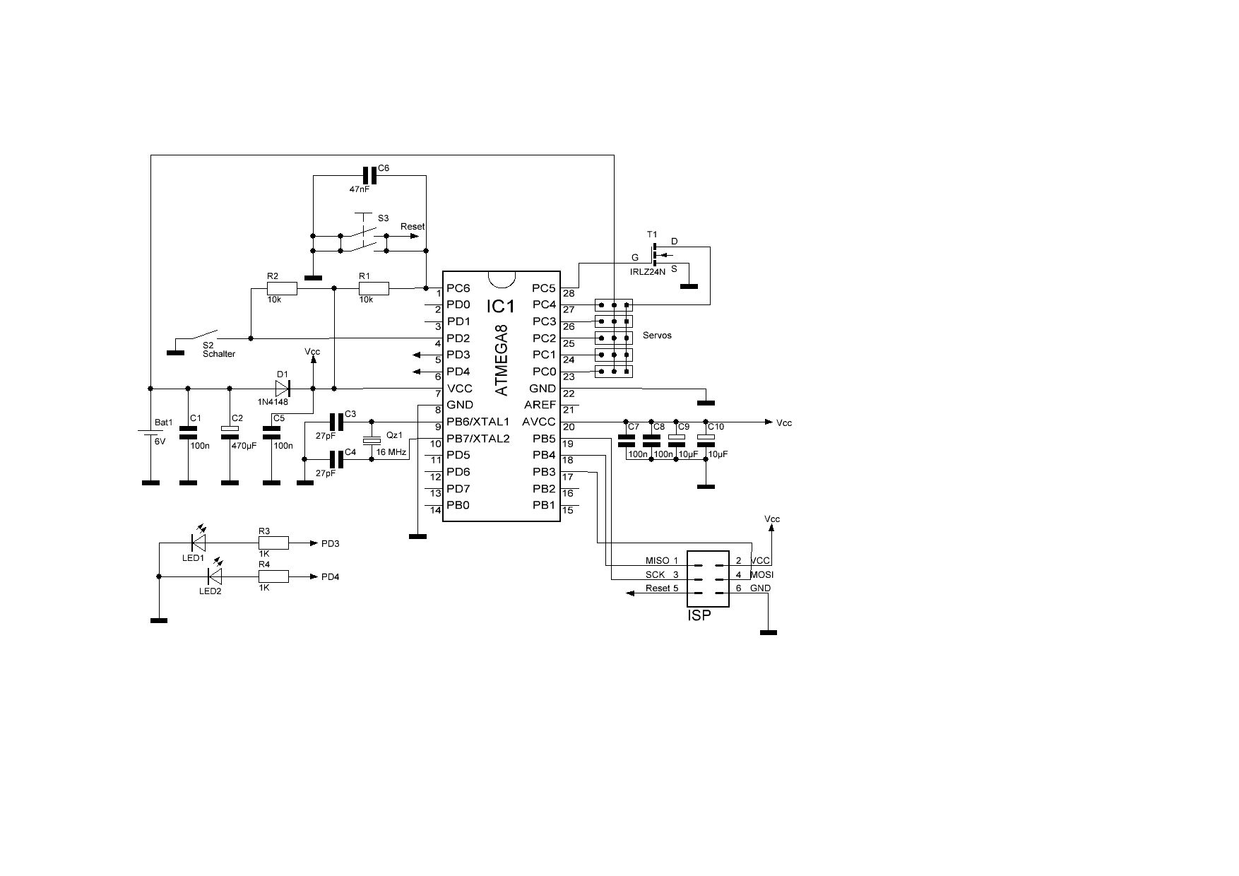 Die Schaltung wird mit 4XAA Bat. betrieben. Die Versorgung für den AVR wird über die Diode geführt. Gemessen beträgt die Spannung 5.3V. Die 6V gehen auf die Servos. Die Masse der Servos wird über den Logiclevel Fet geschaltet. Die Signalleitung der Servos gehen direkt auf den Port.