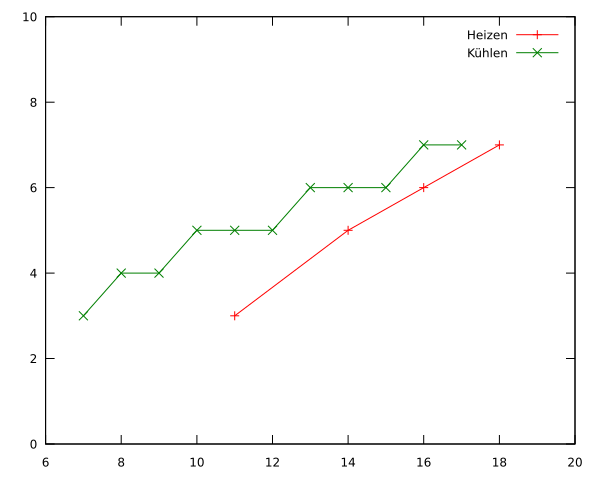 Meinst Du das so? (ist nicht aus Excel, nur zur Präzisierung der Fragestellung) Daten: Heizen 11 3 14 5 16 6 18 7 Kühlen 17 7 16 7 15 6 14 6 13 6 12 5 11 5 10 5 9 4 8 4 7 3