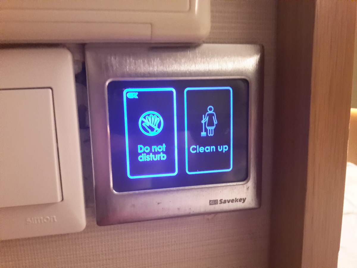 Hübsches Detail zur Bedienung im Hotelzimmer -> Anzeige vor der Tür. So muß das sein. Und ebenso oft in besseren Hotels zu finden: Kontaktlose Karten zur Türöffnung (einfach nur ranhalten).