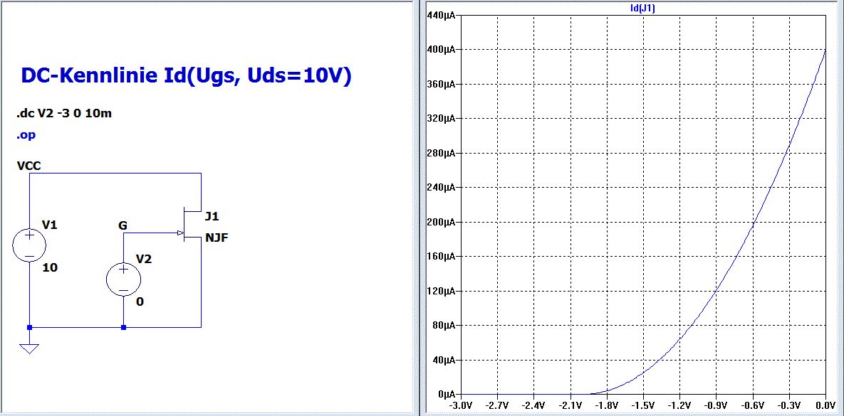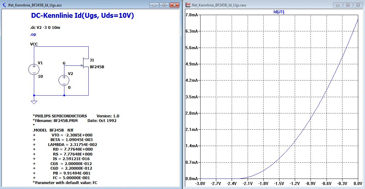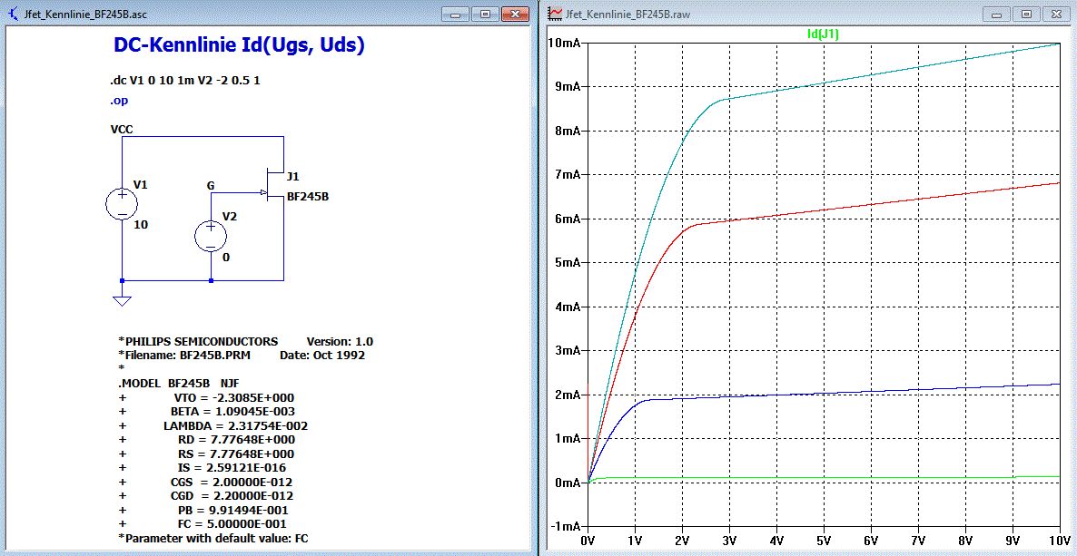 In meinem vorigen Beitrag hatte ich einen Fehler bei Vgs. Das ging bis +0,5V. N-Jfets benutzt man aber sinnvollerweise nur bis 0V Vgs. Hier noch einmal das Beispiel mit LTspice. Das JFET Modell BF245B ist von der NXP Webseite. Simuliert wird mit Vgs = -2V, -1,5V, -1V, -0,5V, 0V Schaltplan: Jfet_Kennlinie_BF245B.asc Plot Settings: Jfet_Kennlinie_BF245B.plt In der .plt kann man Plot-Settings ablegen. Man braucht sie aber nicht unbedingt. Hier die Netzliste des Schaltplans erzeugt mit "View->SPICE Netlist". Zusätzlich habe ich die für dein SPICE überflüssigen/störenden Zeilen entfernt. * Jfet_Kennlinie_BF245B.asc J1 VCC G 0 BF245B V1 VCC 0 10 V2 G 0 0 .dc V1 0 10 1m V2 -2 0 0.5 * *PHILIPS SEMICONDUCTORS Version: 1.0 *Filename: BF245B.PRM Date: Oct 1992 * .MODEL BF245B NJF + VTO = -2.3085E+000 + BETA = 1.09045E-003 + LAMBDA = 2.31754E-002 + RD = 7.77648E+000 + RS = 7.77648E+000 + IS = 2.59121E-016 + CGS = 2.00000E-012 + CGD = 2.20000E-012 + PB = 9.91494E-001 + FC = 5.00000E-001 *Parameter with default value: FC * DC-Kennlinie Id(Ugs, Uds) .end LTspice gibt es hier. http://ltspice.linear-tech.com/software/LTspiceIV.exe