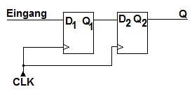 Aber das heißt doch, dass der Ausgang des zweiten FlipFlops dann nicht unbedingt den Zustand anzeigen wird, der eigentlich gewünscht ist, oder? Wenn man nach dem 1. FlipFlop beispielsweise High haben wollte, kann es doch sein, dass nach dem 2. FlipFlop dann Low da ist, oder nicht?