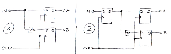 Schlumpf schrieb: > Darum synchronisiert man und erst den Ausgang der Synchronisationsstufe > gibt man dann auf die restlichen FFs der Schaltung. So kann man sich > sicher sein, dass wenigstens alle FF immer die identische Information > bekommen. Schlumpf hat das schön erklärt. Ich habe mal eine Schaltung aufskiziert (nicht schön aber selten). Manchmal sagt ein Bild mehr als viele Worte. In Fall (1) wird der Eingang IN nicht auf den Takt aufsyncronisiert. Hier kann es passieren, dass A und B gleiche Zustände annehmen. In Fall (2) syncronisiert das Eingangs Flip-Flop das Signal (IN) auf den Takt auf. Das stellt sicher, dass zum Zeitpunkt der Taktflanke die Eingänge der weiteren Flips-Flops immer unterschiedlich sind.