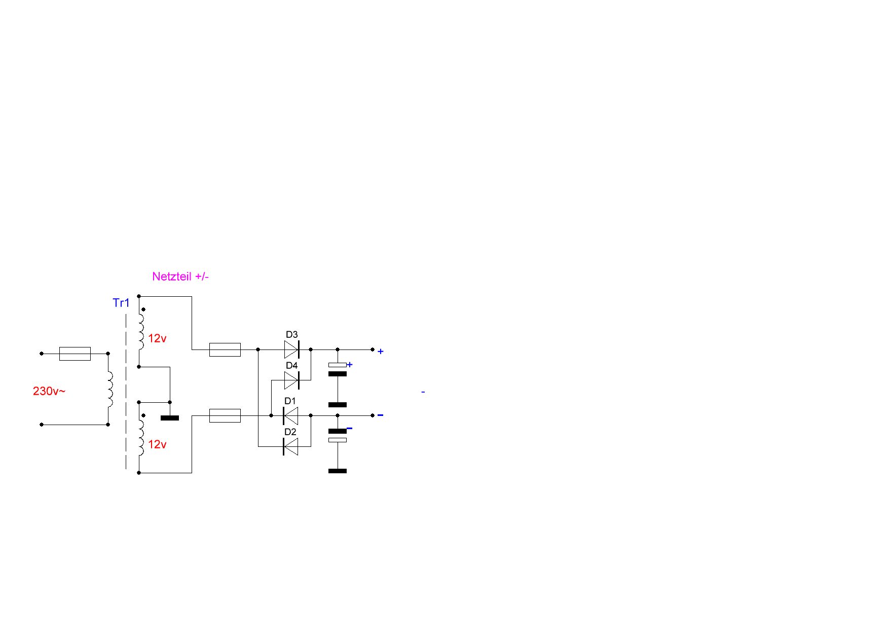 Michel W. schrieb: > An welchen Pins auf der Primärseite werden die 230V also L + N 7 und 1 > und an > welchem Pin die Erde angeschlossen? Gar keinem. > - An welchen Pins auf der Sekundärseite werden die 12V abgegriffen? Dreh den Trafo so, dass die 8 oben ist. Verbinde 9 und 13. Dann hat er die 3 Anschlüsse wie im Schaltplan. > - Ist dieser Trafo mit 13VA überhaupt für diese Schaltung geeignet oder > liefert er bereits zu viel Leistung? Er kann nicht zu viel haben. > - Auf dem Schaltplan ist am Trafo ein Massesymbol eingezeichnet, also > muss ich diesen mit dem selben Pin verbinden, an dem die Erde aus der > Steckdose angeschlossen ist Nein. > und das ganze dann mit der Masseleitung der > restlichen Schaltung verbinden? Ja. Der 2 x 12V Trafo ist für 7812 fehldimensioniert. Du hättest einen 2 x 15V Trafo benötigt, damit die Schaltung auch bei geringer Netzspannung funktioniert. Der eine 2200uF Elko ist ungeschickt. Baue lieber 2 ein. o--+ +--+-----|>|--+---+--7812 S:S | | | S:S | +--|>|--+ 2200uF S:S | | | S:+--)--)-----------+-- Masse S:S | | | S:S +--)--|<|--+ 2200uF S:S | | | o--+ +---.-+--|<|--+---+--7912