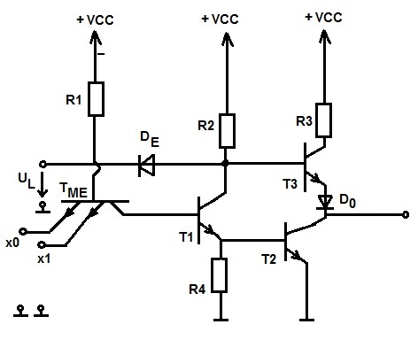 Sehr wahrscheinlich muss ich in der Klausur erklären können, wie der ENABLE Eingang funktioniert. Ein Verständnisproblem gibts da: Wenn der ENABLE-Eingang auf U_LOW (0) ist und ich den Multiemitter-T mit Low auf X0 oder X1 zum leiten bringe, dann sperrt T2. Folglich leitet die Diode und über R2 fließt ein Strom über den Enable-Pfad. Aber: Wenn T2 sperrt, dann liegt doch an der Basis von T3 ein High-Potential an, wieso leitet T3 nicht auch? Das versteh ich nicht ... liegt es daran, dass die Diode niederohmiger wird als der Basis-Emitter Pfad von T3 und deswegen alles über D_Enable geht? Vielen Dank im Voraus!