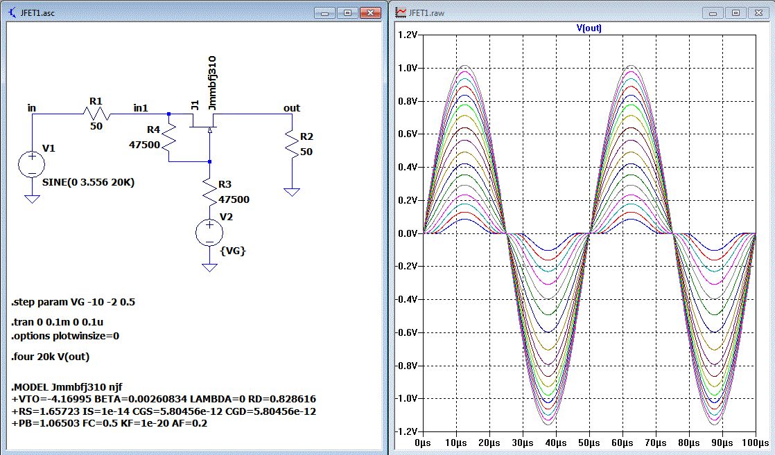 Also der Klirrfaktor ist ziemlich hoch. Arbeitest du wirklich mit 50Ohm Innenwiderstand des Generators und 50Ohm Abschlußwiderstand? Ergebnisse der .FOUR Analyse View -> SPICE Error Log .step vg=-10 Total Harmonic Distortion: 48.187105%(48.193013%) .step vg=-9.5 Total Harmonic Distortion: 37.435541%(37.441727%) .step vg=-9 Total Harmonic Distortion: 28.541875%(28.543692%) .step vg=-8.5 Total Harmonic Distortion: 21.013451%(21.017125%) .step vg=-8 Total Harmonic Distortion: 14.888299%(14.888751%) .step vg=-7.5 Total Harmonic Distortion: 10.770830%(10.771477%) .step vg=-7 Total Harmonic Distortion: 9.225121%(9.225329%) .step vg=-6.5 Total Harmonic Distortion: 9.138599%(9.138635%) .step vg=-6 Total Harmonic Distortion: 8.491266%(8.491279%) .step vg=-5.5 Total Harmonic Distortion: 7.461658%(7.461657%) .step vg=-5 Total Harmonic Distortion: 6.468318%(6.468317%) .step vg=-4.5 Total Harmonic Distortion: 5.661588%(5.661587%) .step vg=-4 Total Harmonic Distortion: 4.996798%(4.996797%) .step vg=-3.5 Total Harmonic Distortion: 4.442129%(4.442128%) .step vg=-3 Total Harmonic Distortion: 3.974404%(3.974402%) .step vg=-2.5 Total Harmonic Distortion: 3.576320%(3.576318%) .step vg=-2 Total Harmonic Distortion: 3.234702%(3.234700%)