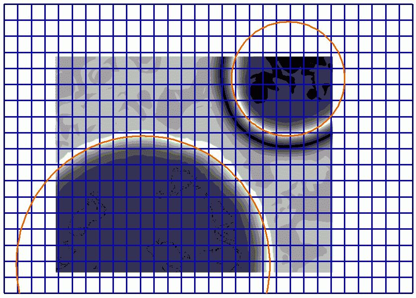 Aus einer Bildverarbeitung kommen 2D-XY-Daten in einen Bildspeicher, der von einem Videoprozessor ausgelesen wird. Im Bild (hell-dunkel), das stark verrauscht ist, sollen Kreise identifiziert werden. Der Mittelpunkt kann dabei ausserhalb des Bildes liegen. Es gibt einen dark spot und einen light spot, deren Grösse und Lage bestimmt werden sollen. Infolge diverser Effekte sind die Kreise leicht deformiert. (Real sind es Kugelprojekttionen, die schwimmen und verwackeln). Angedeutet ist der Bilduschnitt im Videospeicher. Das Bild kann mehrfach ausgelesen, zwischengespeichert und analysiert werden. Was ich schon hinbekommen habe, ist das Bild so zubearbeiten, dass ich das Rauschen weg habe und Kreise ausweisen kann. Wie gelange ich nun zu den Parametern R und Xm,Ym?