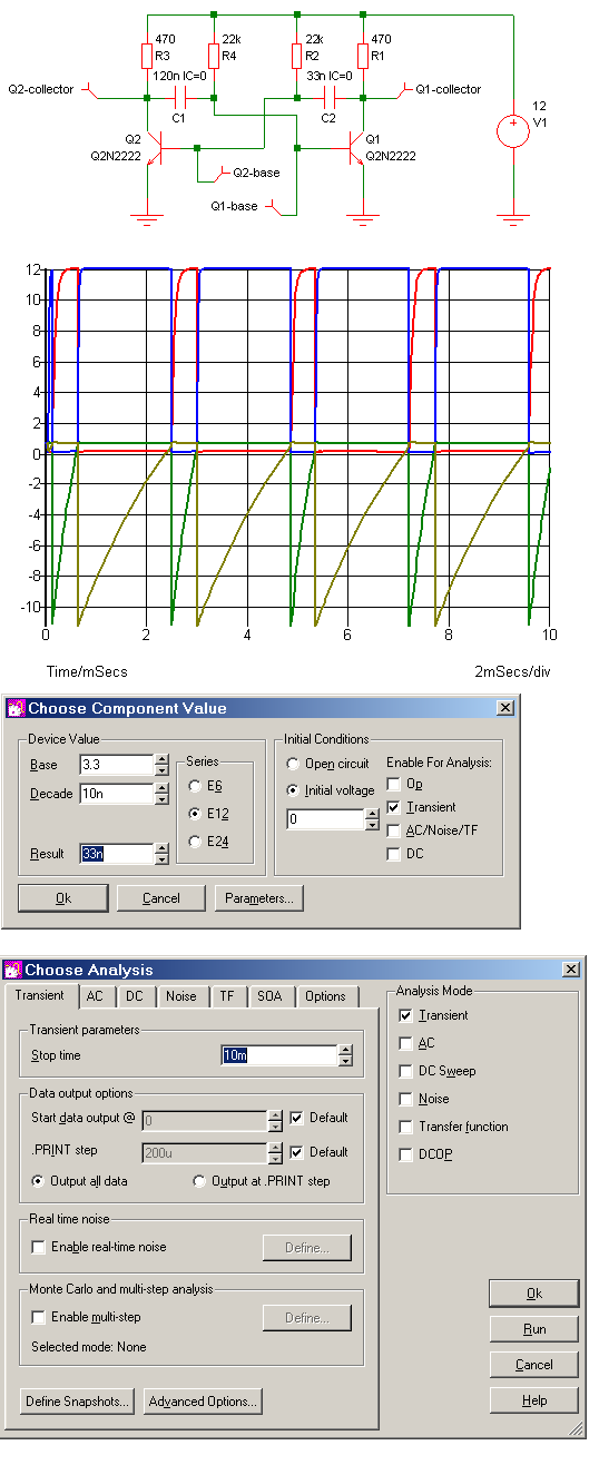 Hallo Mike, ich bin auch Nutzer von SIMetrix und kenne mich inzwischen zumindest so gut aus, dass ich andere Simulatoren, die ich (nicht so gut) kennengelernt habe, nicht mehr benutze. Dein(e) Probleme: 1. Du musst Voltage-Probes setzen (Strg-B). 2 Du musst den Kondensatoren "sagen" dass die bei der Simulation mit 0 V starten soll (F7). 3. Du musst die Simulation natürlich richtig einstellen (Choose Analysis). Dann wird mit F9 die Simulation gestartet. Wie man dann sieht, geht es dann auch. PS: Mein seliger Vater pflegte zu sagen: "Die Lage ist erst dann beschissen, wenn wir uns nicht zu helfen wissen".