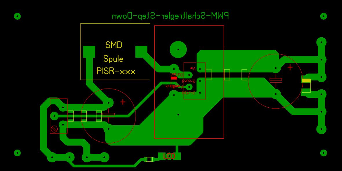 Nachtrag: Die kleinen Elkos habe ich einfach auf die Lötseite parallel zu den gro0en Elkos gehangen. Wenn alles korrekt rennt (oder ich auf was anderes umsteigen muss wegen der effizienz) mache ich nochmal eine richtige Platine. Es ging primär darum das die angeschlossene Elektronik schnell läuft da sich das Projekt schon etwas zieht. Habe ich beim Layout was so schlimm verbockt das der Wirkungsgrad so mies ist? Stromquelle für die 24V ist übrigends ein Mean-Well Schaltnetzteil der Industrieserie (die in der "Gitterkiste") mit 75W Leistung.
