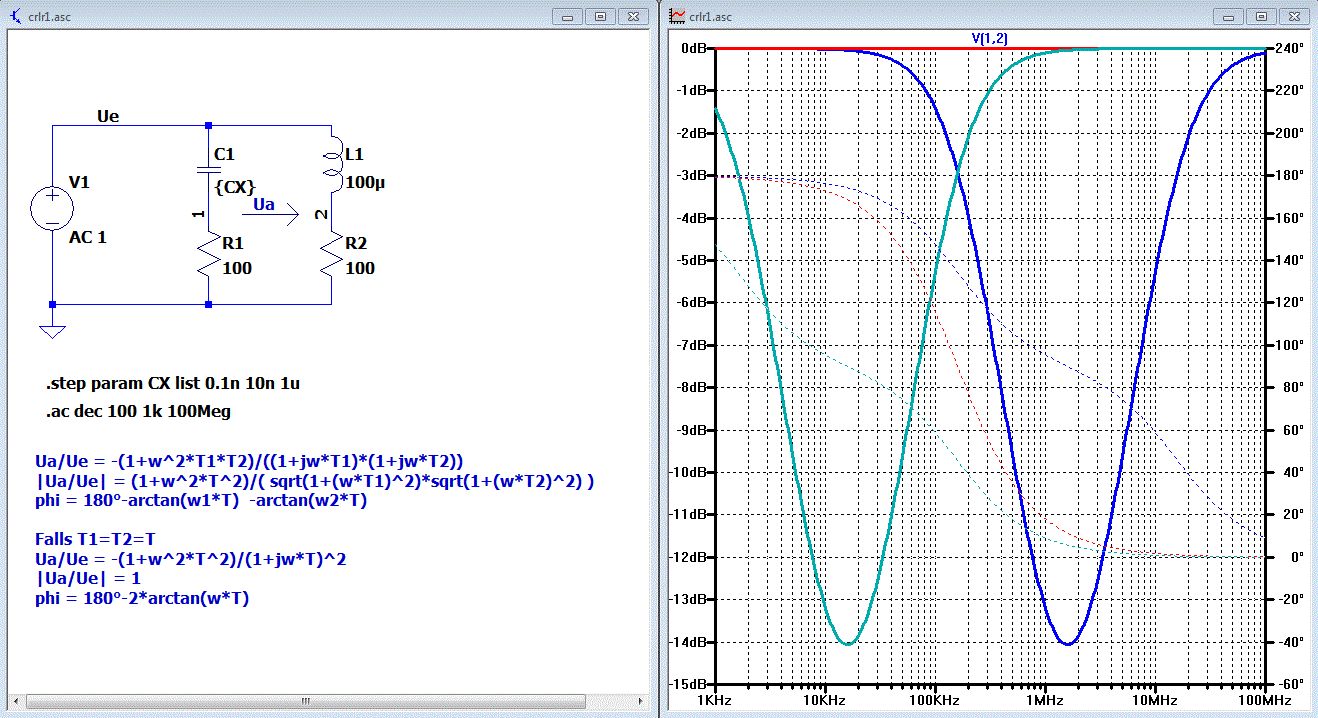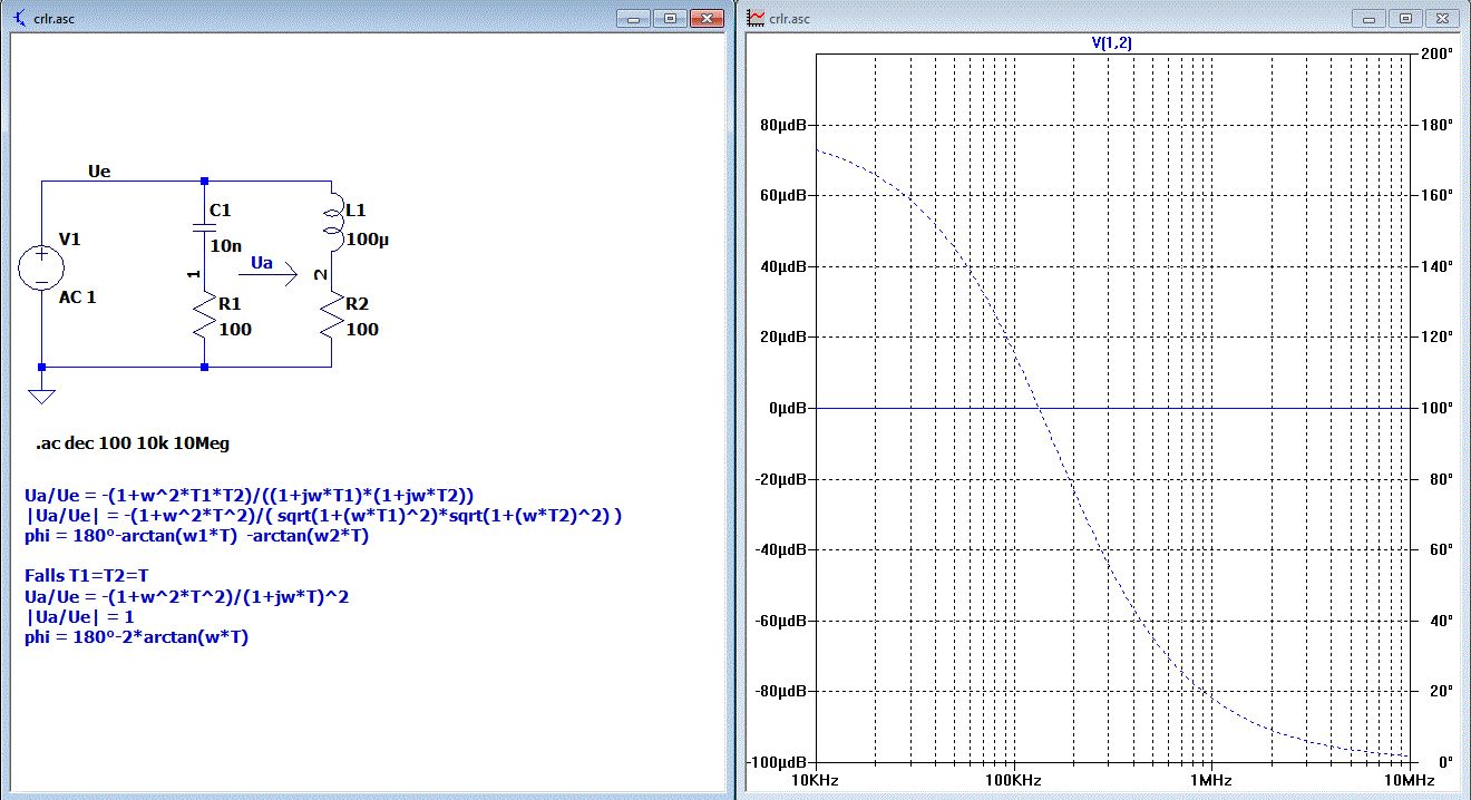 Im Anhang die Simulation mit LTspice, dem kostenlosen SPICE-Programm. http://ltspice.linear-tech.com/software/LTspiceIV.exe crlr.asc ist der Schaltplan für LTspice. crlr.plt enthält die Plot-settings für die hier gezeigte Simulation. Korrektur: In der Formel im angehängten Bild muß bei |Ua/Ue| das Minusvorzeichen weg. Ua/Ue = -(1+w^2*T1*T2)/((1+jw*T1)*(1+jw*T2)) |Ua/Ue| = (1+w^2*T^2)/( sqrt(1+(w*T1)^2)*sqrt(1+(w*T2)^2) ) phi = 180°-arctan(w1*T) -arctan(w2*T) Falls T1=T2=T Ua/Ue = -(1+w^2*T^2)/(1+jw*T)^2 |Ua/Ue| = 1 phi = 180°-2*arctan(w*T)