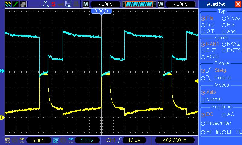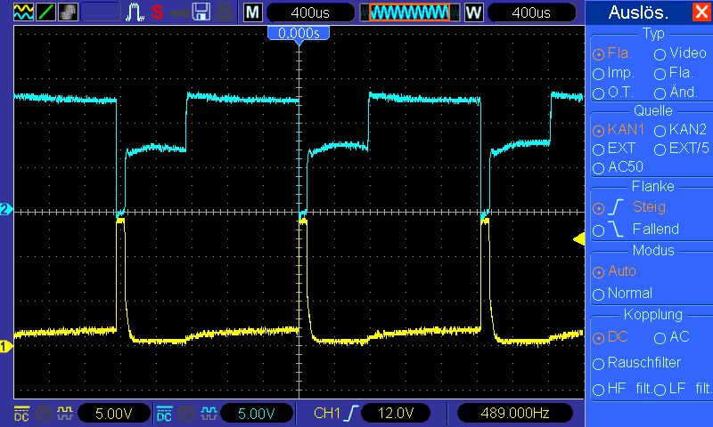0804 schrieb: > Genau an dieser Stelle wird der ADC getriggert damit er misst. > So wird nicht die volle Versorgungsspannung sondern nur die EMK des > Motors gemessen. > Bei 16kHz 16000Mal die Sekunde. > Beim STM32 sind die ADCs allerdings auch sehr schnell. Ein > STM32F4@168Mhz benötigt <1uS für ein ADC Sample. Ich könnte ja auch einen F4 nehmen, nur ist das einem Motor völlig egal ;-) Angehängt sind zwei Bilder, die die Spannungen am Motor mit L6203 und PWM am Enable-Eingang zeigen: jeweils 60% PWM einmal ohne Last und einmal mit Last an der Motorachse. Der Triggerpunkt in der Mitte zeigt das Abschalten der PWM. Danach muß die Freiwerdezeit des Motors abgewartet werden, bevor die EMK als Differenz zwischen oberer und unterer Kurve meßbar wird. Nach 800 µs beginnt ein neuer PWM-Zyklus. Unter Last ist die Freiwerdezeit des Motors 'dummerweise' länger und die Phase für die EMK-Messung kürzer. Wegen der geringeren Drehzahl ist auch die EMK selbst verringert. Wie man sieht, hilft ein schneller ADC hier garnicht. Man muß zunächst die Freiwerdezeit kürzer bekommen, indem man den Motor nicht zu lange aber ganz 'rabiat' kurzschließt.