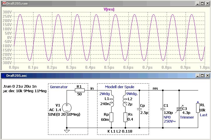 Genau das ist Sinn und Zweg der Schaltung. Ich habe nen Kalium-Laser und den schicke ich durch einen EOM. Den EOM treibe ich mit dem Frequenzgenerator. Und um die Spannung am EOM höher als die max. 20Vpp des Frequenzgernators zu machen, willl ich einen Schwingkreis zwischenhängen, der mir die Spannung möglichst überhöht. Also brauche ich auch ein hohes Q im Schwingkreis. Die Verluste am EOM sind relativ gering, da er Gold-Elektroden hat zwischen denen der eigt. Kristall (oder das Dieelektrikum)eingefasst ist. Der hat selber eine Kapazität von ungefähr 14pF