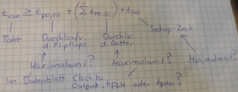 Das Datenblatt habe ich ja nur als Beispiel genommen :) Das Lesen von Datenblättern ist auch immer so eine Sache am Anfang ... Da wäre noch was: Wenn ich die maximale Taktperiode für meine digitale Schaltung berechnen will, dann muss ich ja folgende Gleichung anwenden (Bild) Taktsignal größer oder gleich (Durchlaufverzögerung der FlipFlops) + Summe der Durchlaufverzöerung der Gatter + SetUp-Zeit Diese Durchlaufverzögerung wird in den Datenblättern doch Clock to Output genannt, oder? Meistens ist t_PLH oder t_PHL angegeben. Für welchen Wert muss ich mich entscheiden wenn ich das berechne? Vielen Dank im Voraus!
