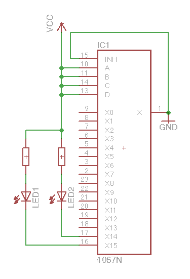 Hallo zusammen, ich habe ein Problem mit folgender einfachen Schaltung. Bei dem Demux (Typ DC4067) sind alle Steuerleitungen A,B,C,D auf HIGH gelegt. Entsprechend sollte doch das Eingangssignal (LOW) auf den Ausgang 16 und NUR! auf diesen geschaltet sein und die grüne LED leuchten. Tut sie ja auch, aber warum leuchtet die rote LED ebenfalls? Sollten die nicht ausgewählten Ausgänge nicht eigentlich "in der Luft hängen"? Ich habe schon einen neuen IC gekauft. Dieser verhält sich identisch, sodass ich einen defekten IC aus Fehlerursache ausschließen würde. Wenn ich die Schaltung so ändere, dass HIGH am Demux-Eingang anliegt, funktioniert außerdem alles. Sieht jemand einen Fehler in der Schaltung? Vielen Dank Johannes PS: Ich weiß, dass an die LEDs eigentlich Widerstände gehören, wollte die Schaltung allerdings so einfach wie möglich halten.