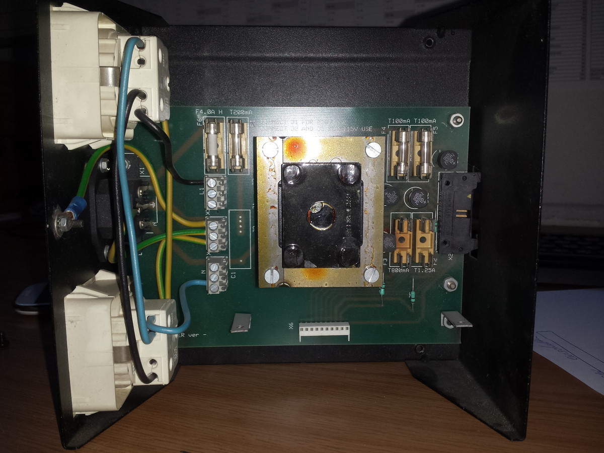 Glaube ich nicht: das Trafolein macht niemals 400VA. Für mich sieht das aus, wie die Reste einer mittels serieller Schnittstelle steuerbaren Schaltbox für Netzspannung. Da fehlt die obere Platine mit der Elektronik.