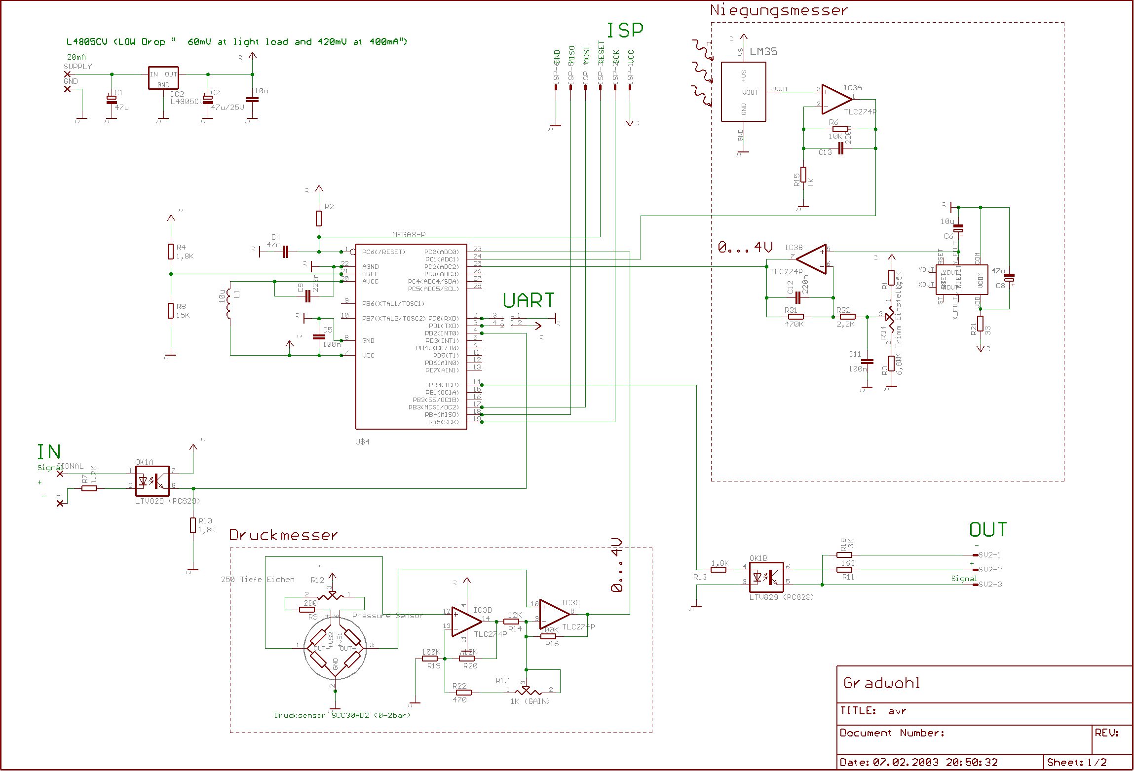 Hallo Hubert, Weil Du ja einen günstigen Sensor suchst: den ADXL... kann man als "Freie Sample" bei Analog Devices bestellen. Der ADXL202E(±1g, zwei Achsen...) ist genauso wie der ADXL05 (±5g, eine Achse..) ein Beschläunigungssesor. Ich benutze den ADXL202E zur Neigungsmessung in meinem Modell-Uboot. Mit Hilfe eines externen Temperatursensors (LM35 6Euro) wird der Temperaturdrift aufgehoben. Schaltung Siehe Anhang. Oder hier http://ngrad.bei.t-online.de/microkontroller.htm Integrieren muss ich bei meiner Schaltung nicht. Man erhält eine Spannung von 0..4V für zB -30°..+30°, welche an dem AD-Wandler gegeben wird... Gruss Zoltan
