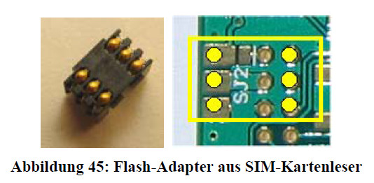 Uwe B. schrieb: > Statt einer normalen Steckerleiste zum Kontaktieren z.b. der CPU ist auf > dem Board nur ein Footprint, auf dem man dann eine TAG-Connect Stecker > fuer x0 Euro stecken kann. Klingt sinnvoll. Früher™ mußte man soetwas noch selbst entwickeln, wenn man die Firmware auf einen SMD-IC flashen wollte, ohne die dicke Steckerleiste zu bestücken und ohne einen Nadeladapter zu besitzen. Hier ein Beispiel, wo der SIM-Karten-Adapter eines alten Handys als Kontaktierstecker herhalten mußte.