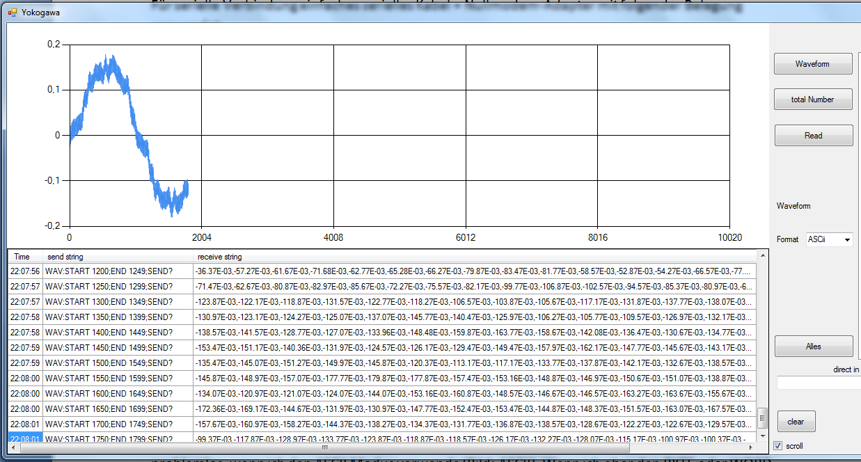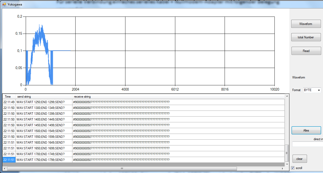 Hi, ich möchte eine Waveform aus dem Yokogawa Oszi DL708E auslesen. Das funktioniert problemlos, wenn ich den ASCII Modus verwende (Bild: ASCII). Wenn ich aber den BYTE oder WORD Modus verwende bekomme ich Unsinn angezeigt (Bild: BYTE). Hat jemand von euch Erfahrung mit dem Yokogawa Osci bzw. dem Auslesen von Waveforms? Vielen Dank im Voraus!