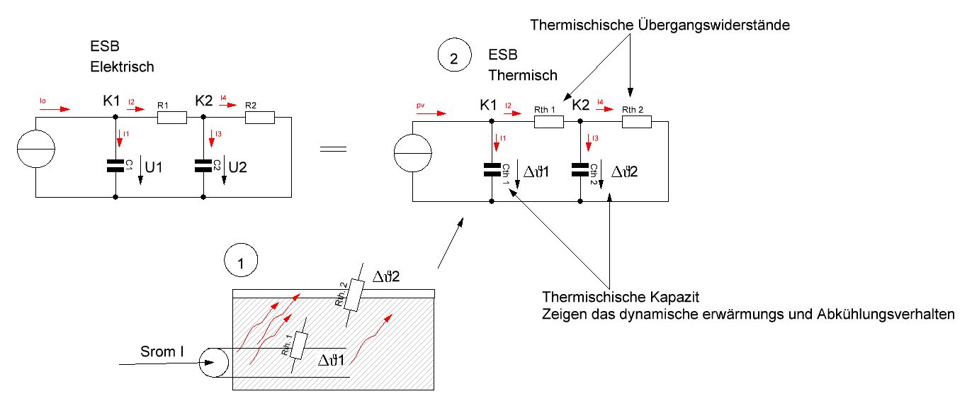 Hallo Leute !! :) Erstmal danke für eure Hilfe. Ich habe die Schaltung geschafft numerisch zu lösen und in Excel auszuführen (numerisch mit Euler). Die Schaltung soll später zu Simulation der Wärmeentwicklung in einem Leiter dienen. In diesem elektrischen Ersatzschaltbild gelten folgende Analogien: Thermisch : Elektrisch: Pv (Wärmeverluste) = I (Elektrischer Strom) V (Temperaturdifferenz) = U (Elektrische Spannung) Rth (Terrmischer Wid.) = R (Elektrischer Widerstand) Cth (Wärmekapazität) = C (Elektrische Kapaz.) E (Thermische Energie) = Q (Elektrische Ladung) Ziel: Man gibt einen Stromwert, der durch eine Leitung fließt. Dabei entstehen Wärmeverluste, die sich über das Leitungsmaterial an z.B. Erde ausbreiten. Nun soll die Temperatur am Mantel und über den Erdreich bestimmt werden. (im ESB: C1 und C2 ) Wie macht man das??? Mein Ansatz: 1)Schritt: Die Startwerte wie "Yalu X" gemeint hat ermitteln: "Ist I irgendeine krumme Funktion der Zeit, kann man die Aufgabe numerisch lösen. Dazu müssen aber die Funktion I(t) sowie konkrete Werte für die Kondensatoren, die Widerstände und die Spannungen U1 und U2 zum Zeitpunkt 0 gegeben sein." 2) Schritt: Mit dem Strom der Angegeben wird Pv (Wärmeverluste) berechen und die gesuchten Temperaturen berechnen.