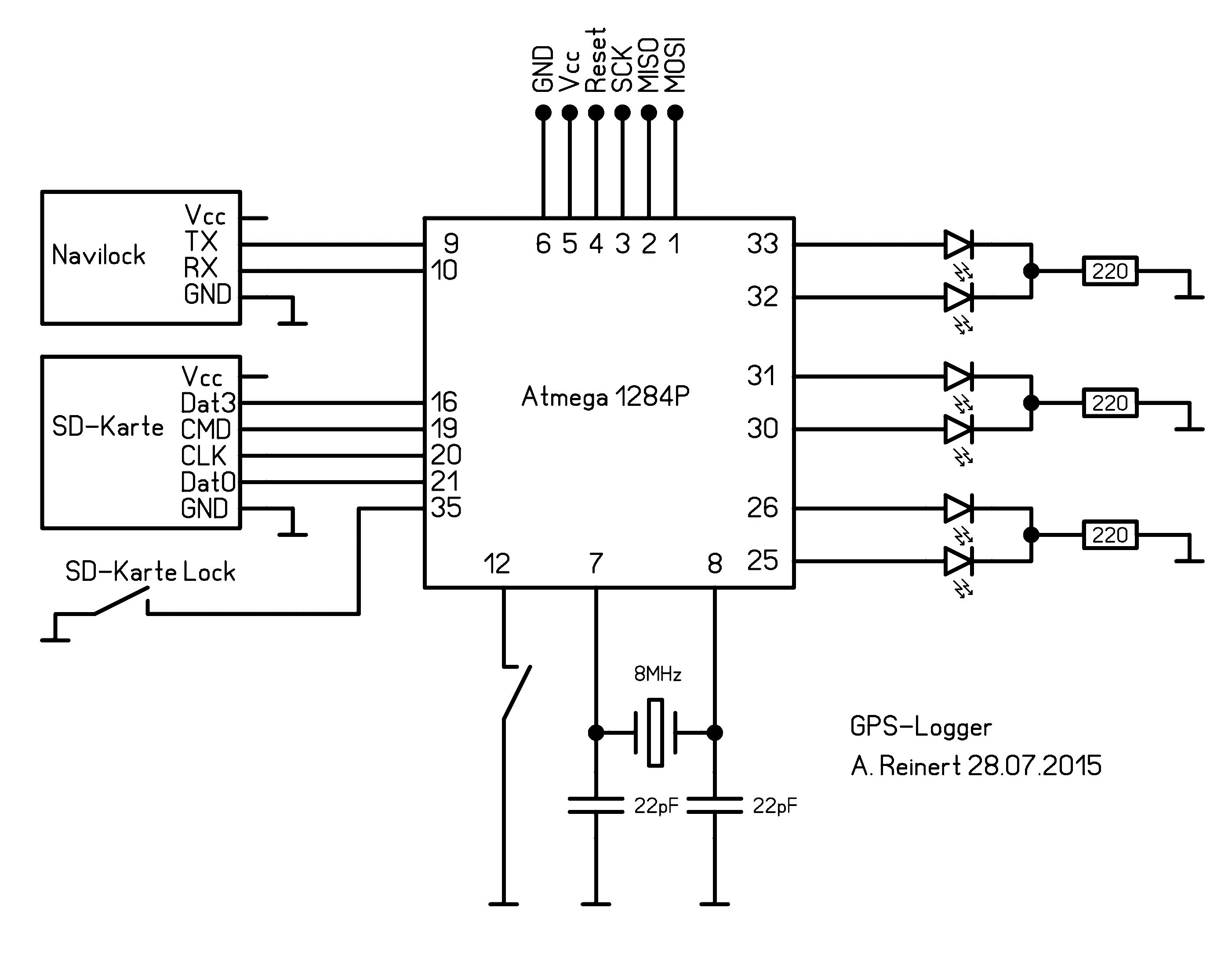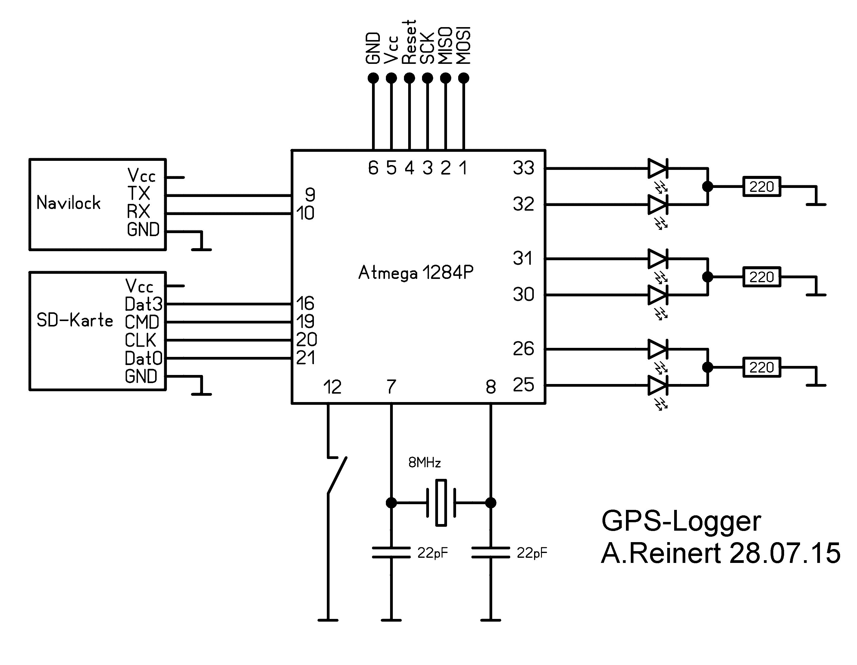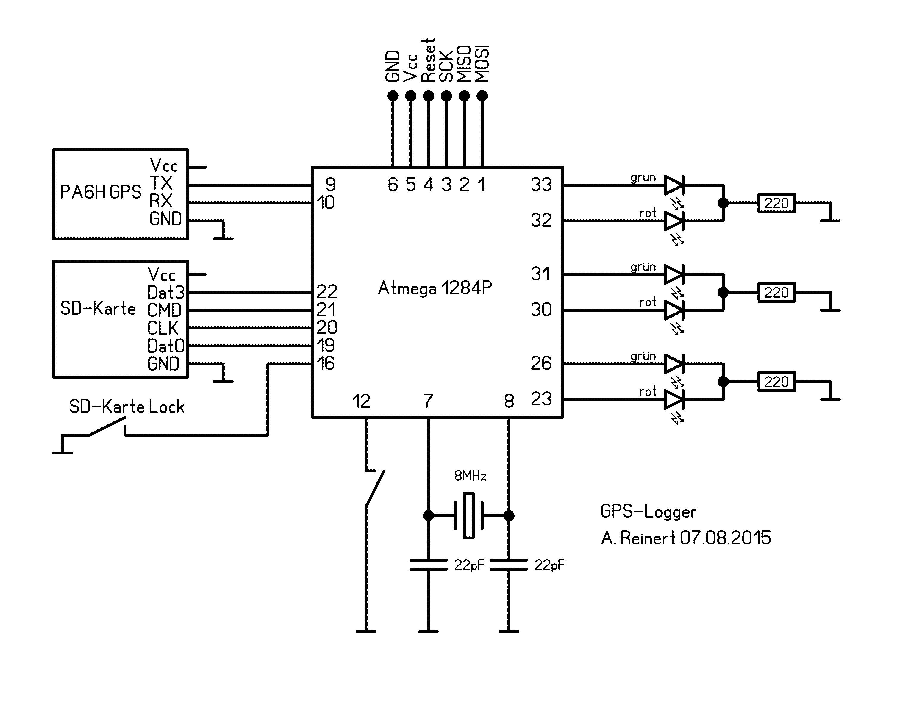 Aufgrund einiger Anfragen hier noch der Schaltplan (3,3V Spannungsversorgung nicht eingezeichnet) sowie das HEX-File zum Mini-GPS-Logger